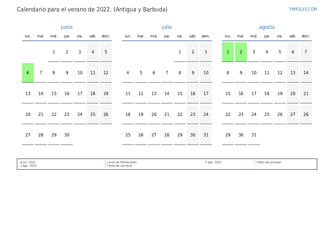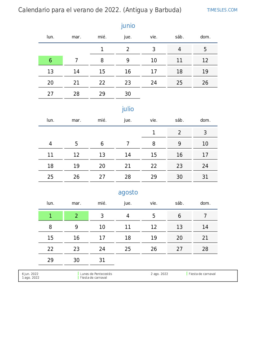 Descargue e imprima el calendario en PDF con festivos y fines de semana para el verano de 2022 para Antigua y Barbuda