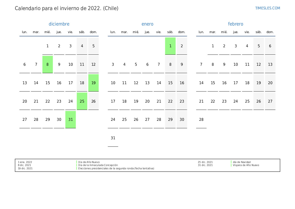 Calendario de festivos y fines de semana para el verano de 2022 para Chile