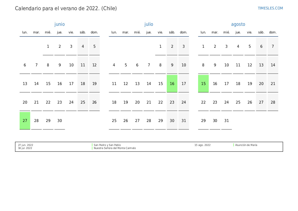 Descargue e imprima el calendario en PDF con festivos y fines de semana para el verano de 2022 para Chile