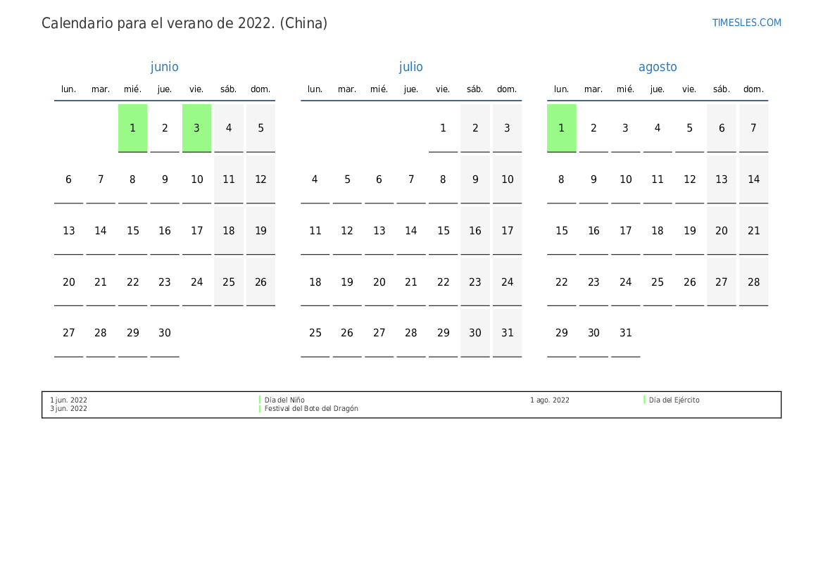 Calendario de festivos y fines de semana para el verano de 2022 para China