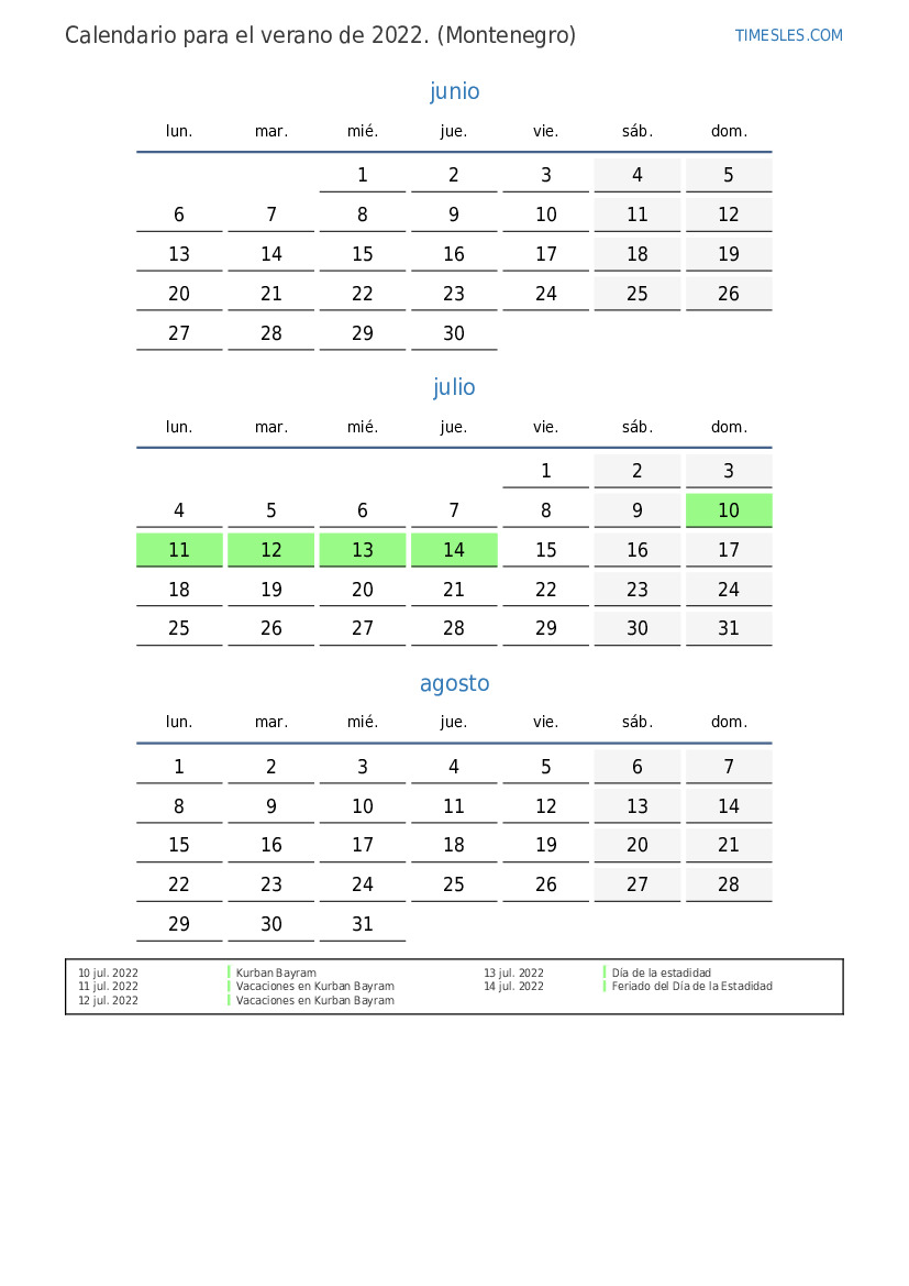 Descargue e imprima el calendario en PDF con festivos y fines de semana para el verano de 2022 para Montenegro