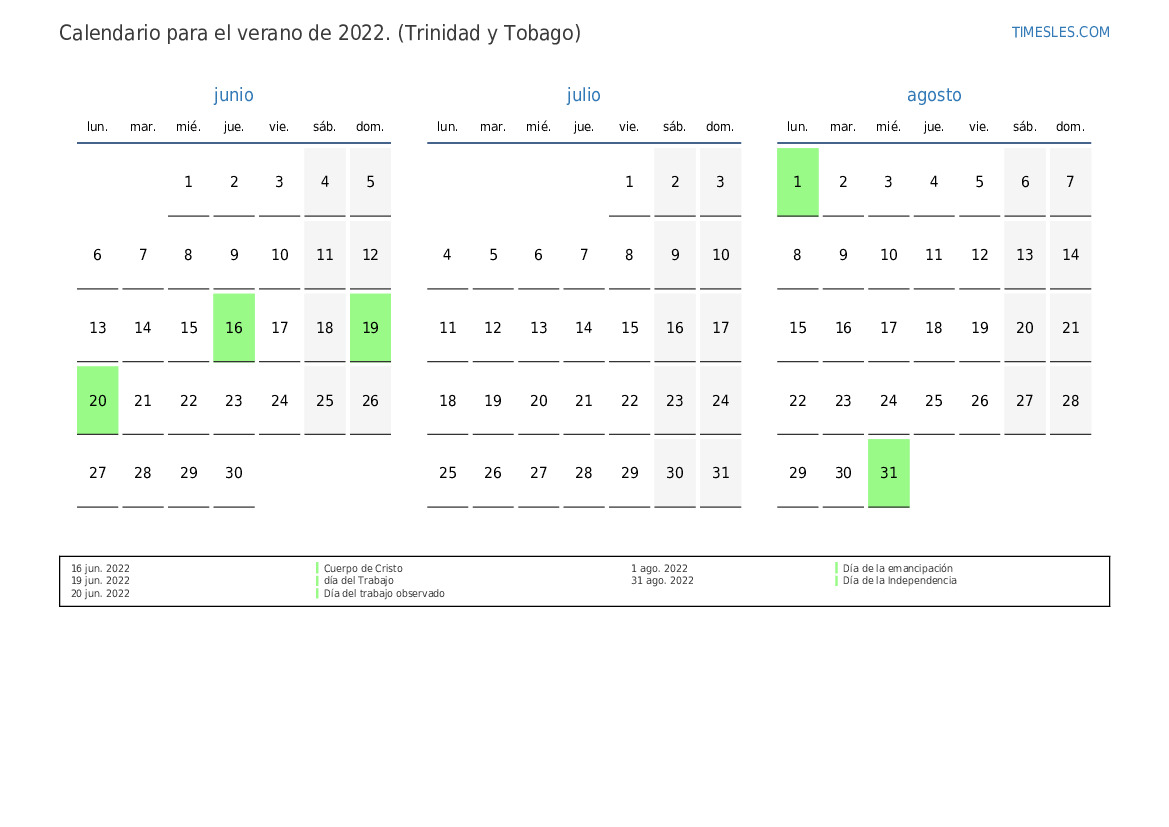 Calendario de festivos y fines de semana para el verano de 2022 para Trinidad y Tobago