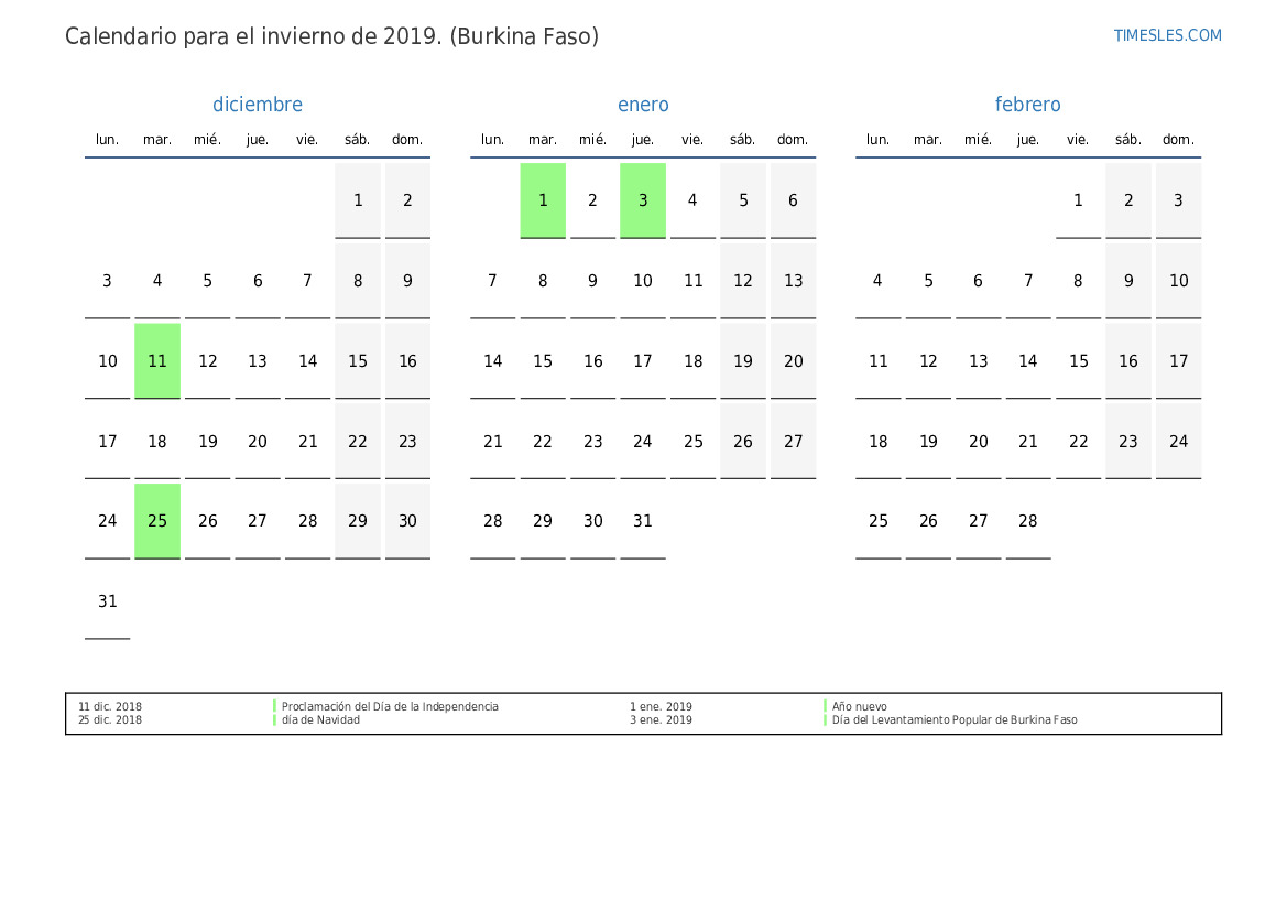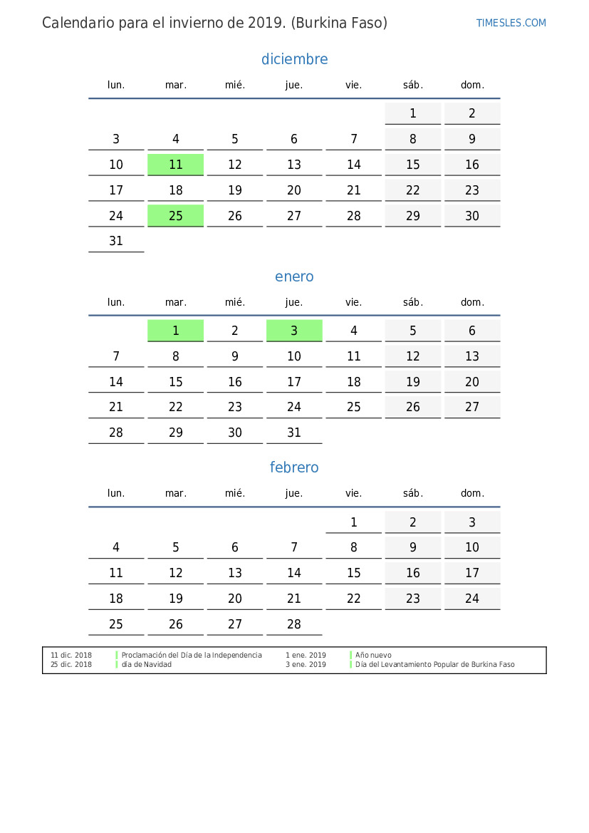 Descargue e imprima el calendario en PDF con festivos y fines de semana para el invierno de 2019 para Burkina Faso