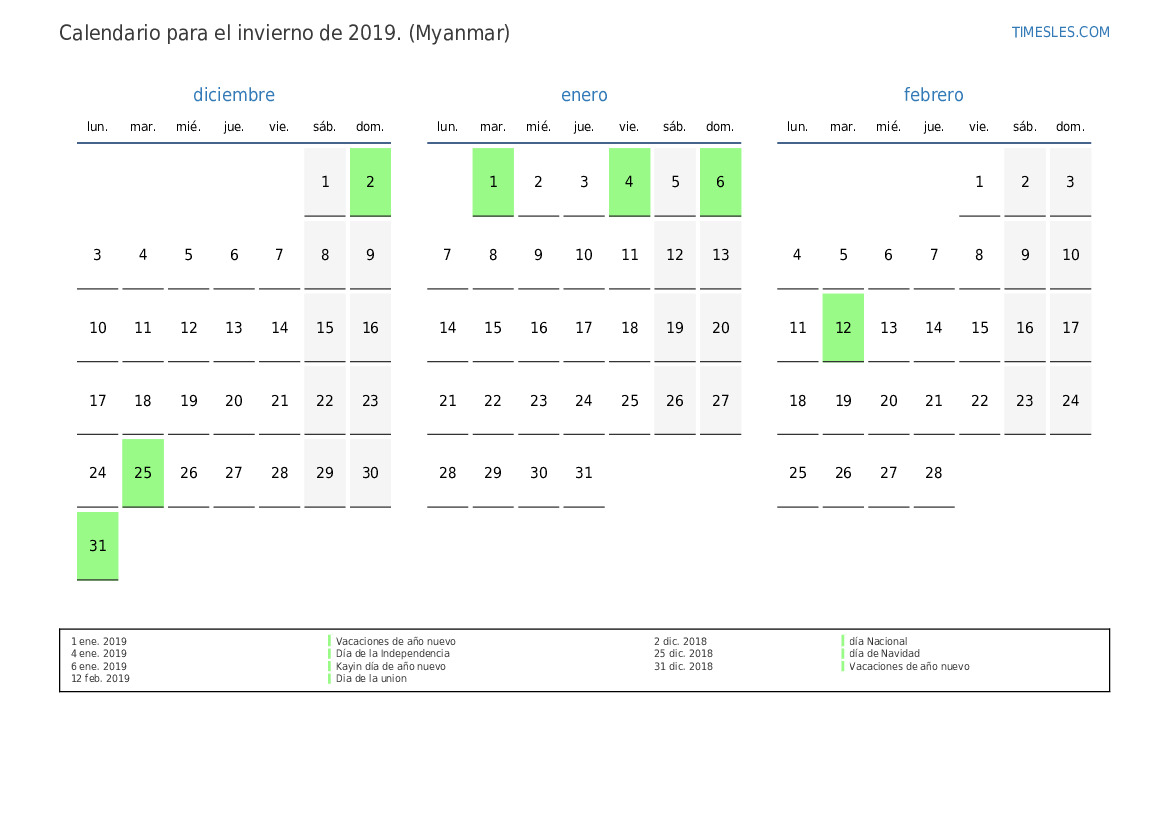 Descargue e imprima el calendario en PDF con festivos y fines de semana para el invierno de 2019 para Myanmar