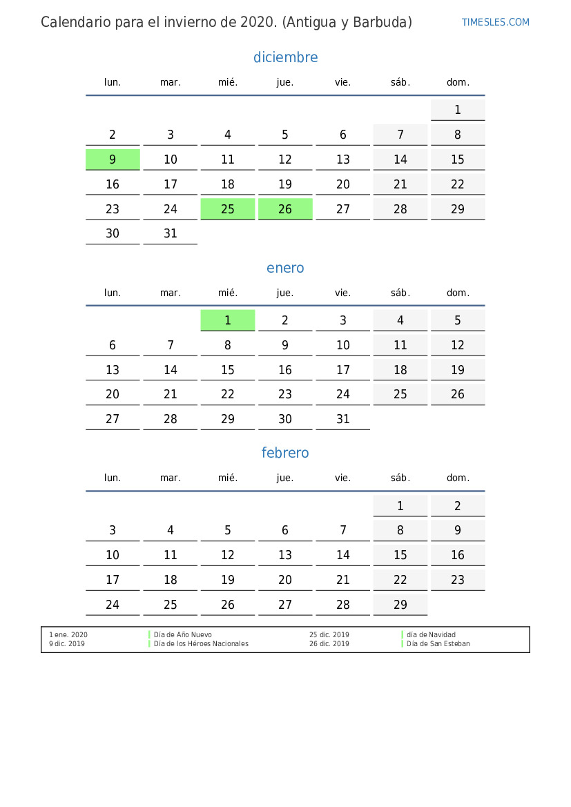 Descargue e imprima el calendario en PDF con festivos y fines de semana para el invierno de 2020 para Antigua y Barbuda
