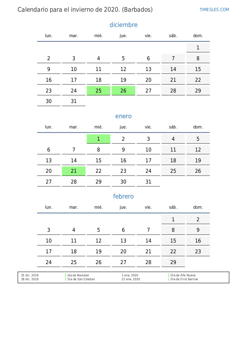 Descargue e imprima el calendario en PDF con festivos y fines de semana para el invierno de 2020 para Barbados