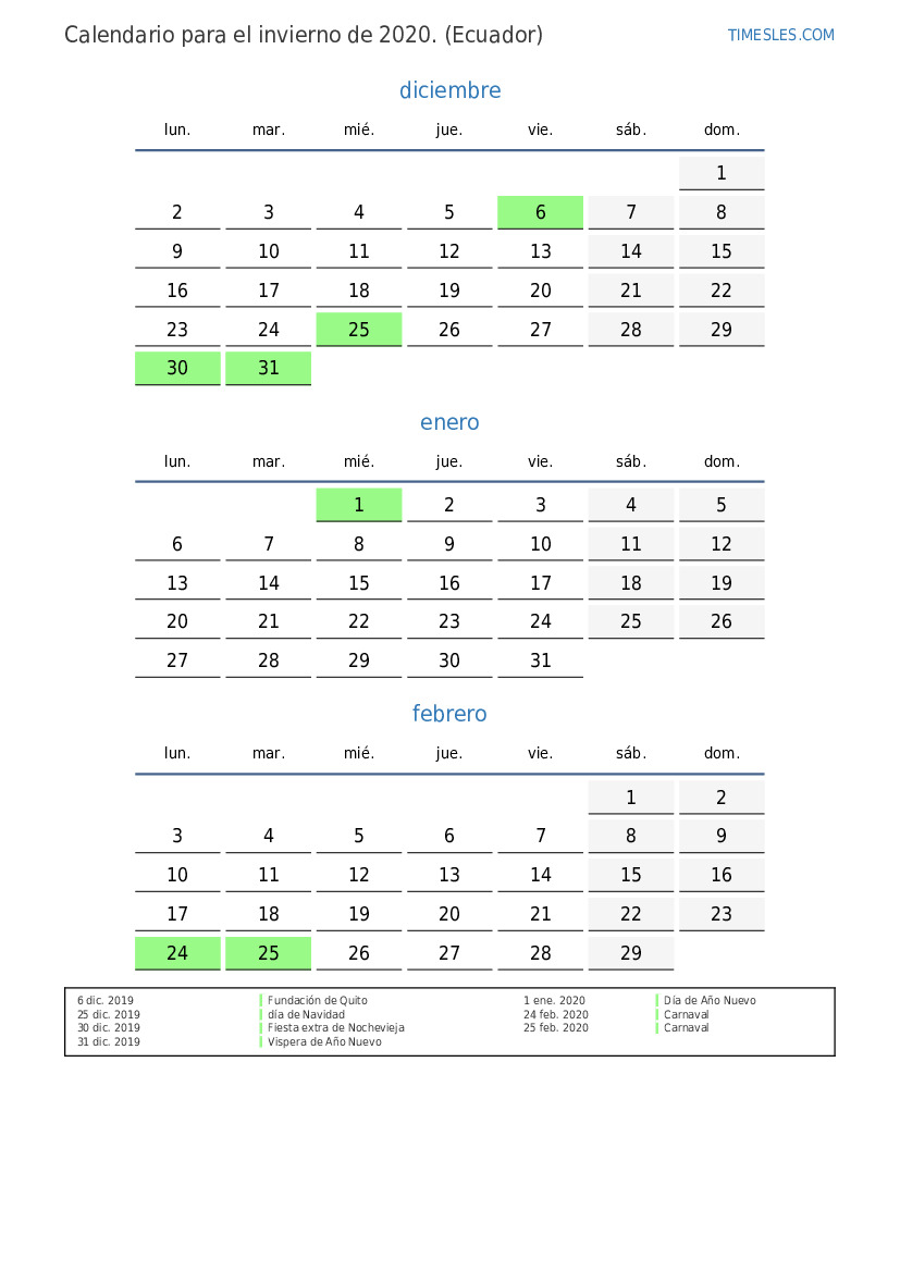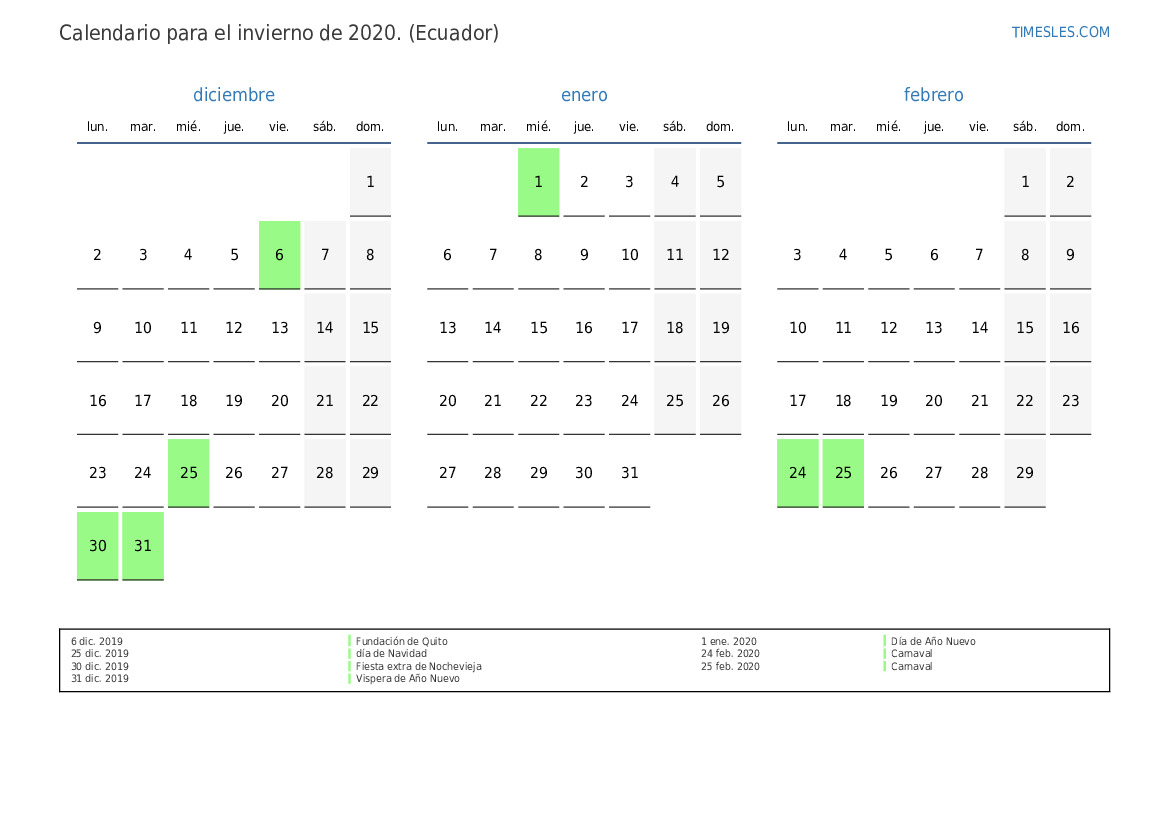 Descargue e imprima el calendario en PDF con festivos y fines de semana para el invierno de 2020 para Ecuador