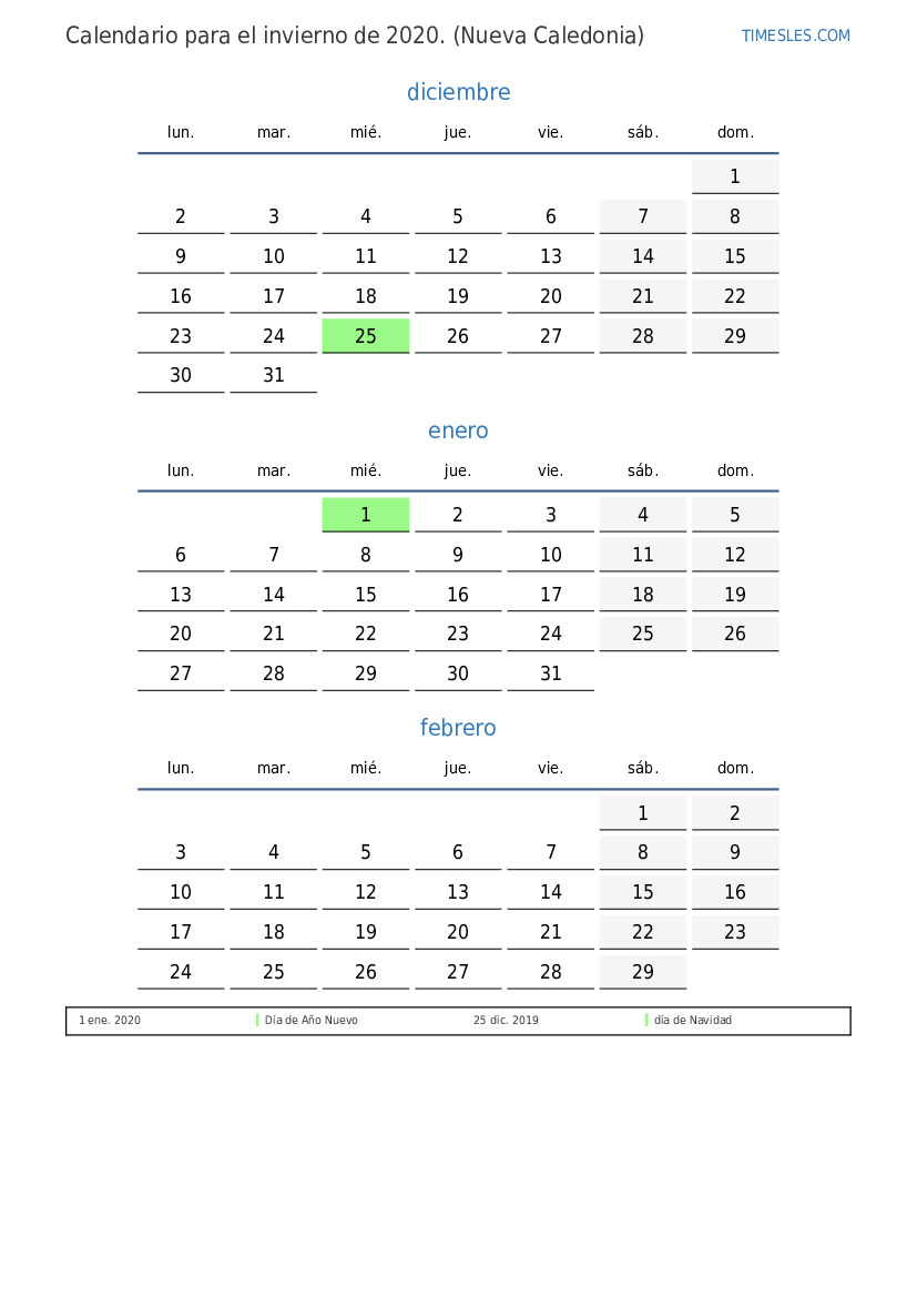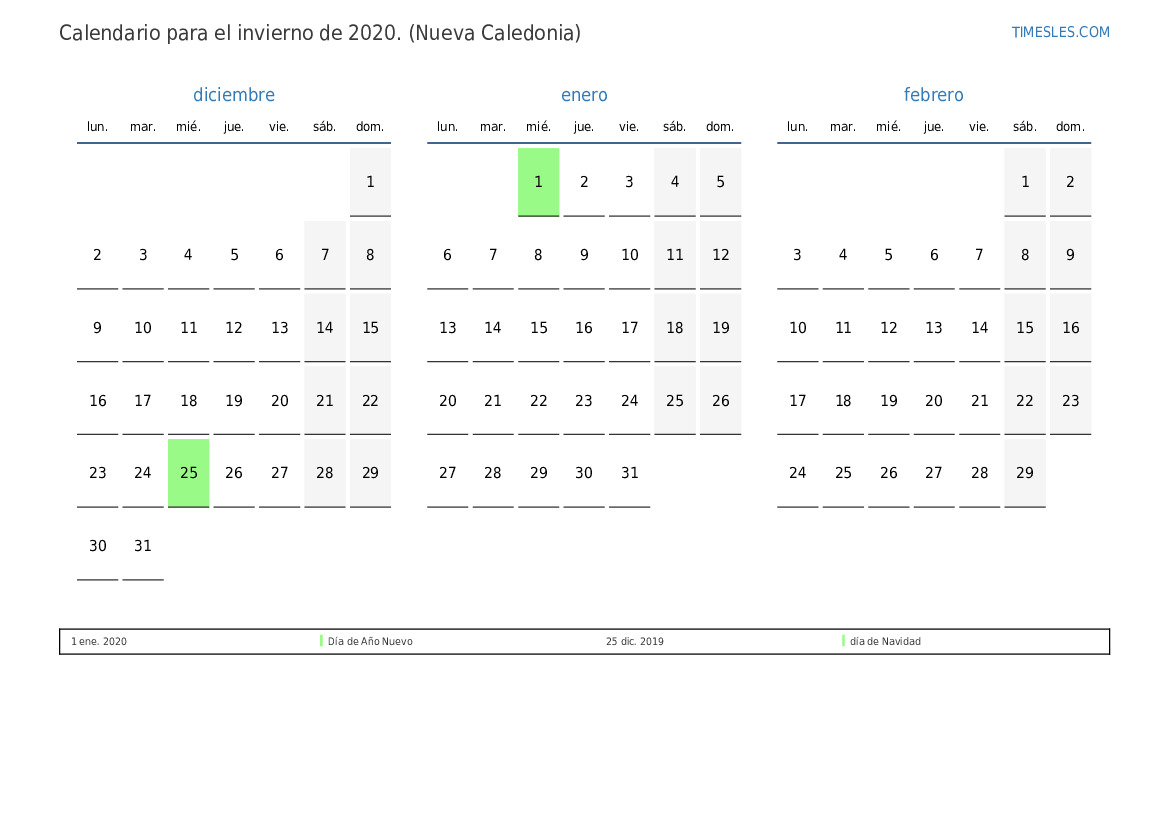 Descargue e imprima el calendario en PDF con festivos y fines de semana para el invierno de 2020 para Nueva Caledonia