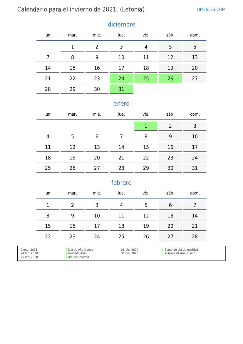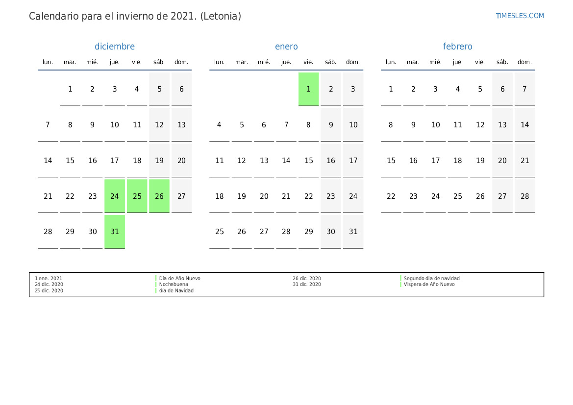 Calendario para el invierno 2021 para Letonia
