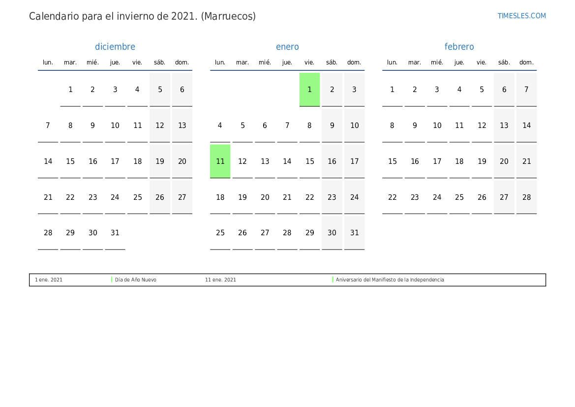 Descargue e imprima el calendario en PDF con festivos y fines de semana para el invierno de 2021 para Marruecos