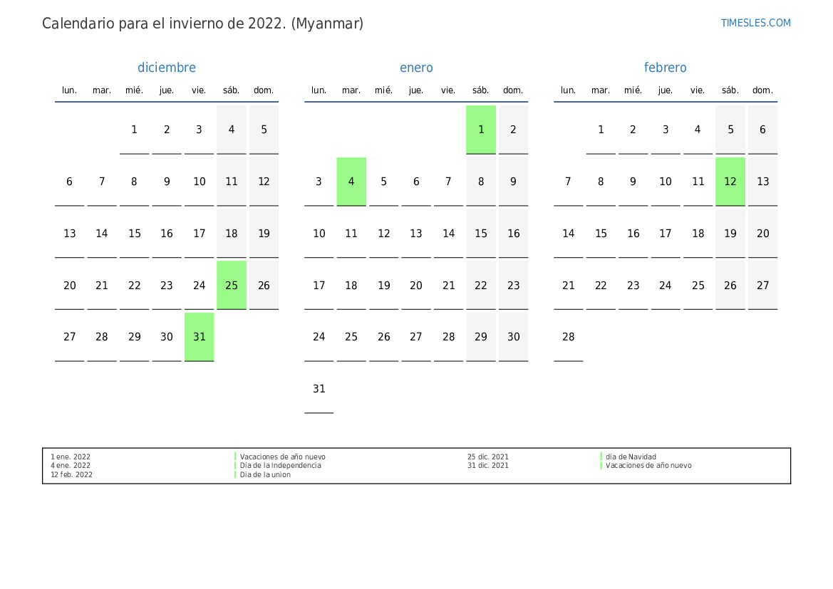 Descargue e imprima el calendario en PDF con festivos y fines de semana para el invierno de 2022 para Myanmar