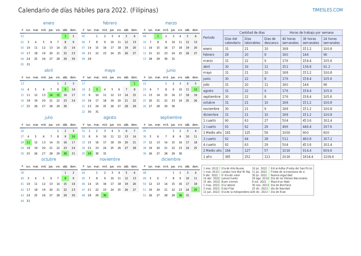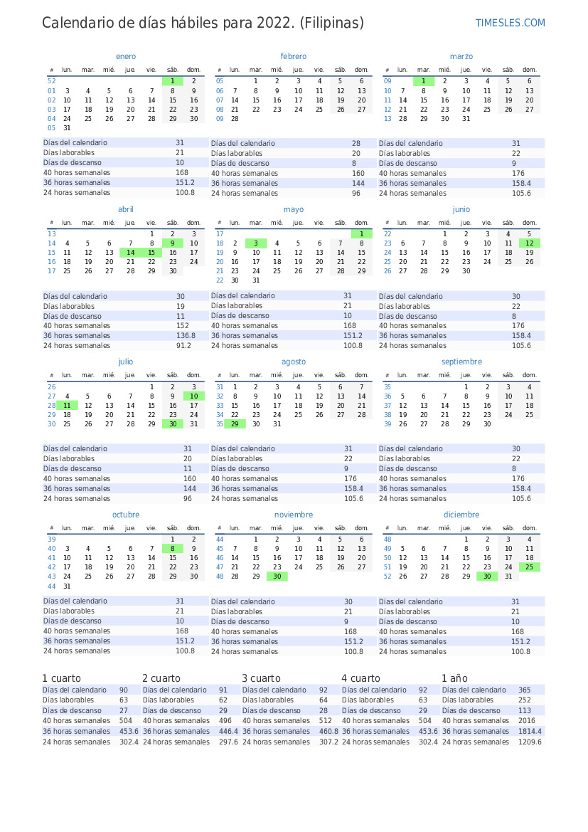 Calendario de días laborables para mayo de 2022 para Filipinas