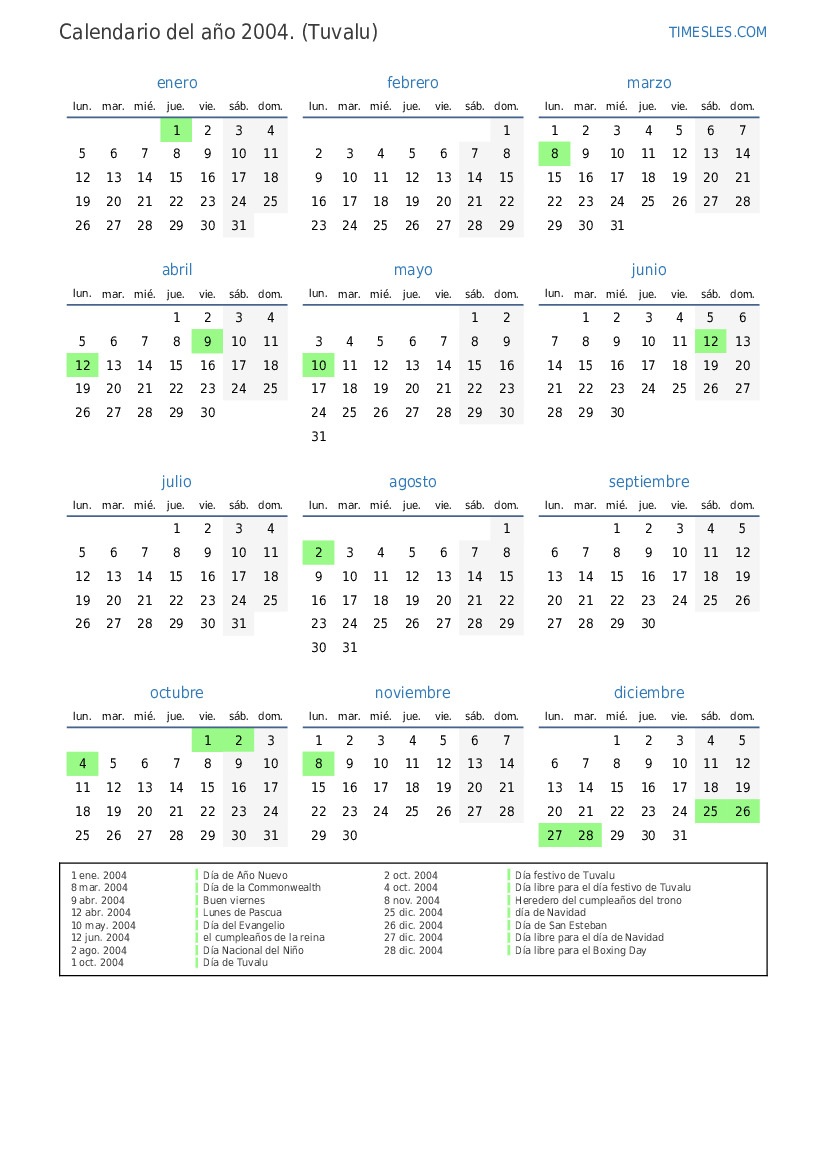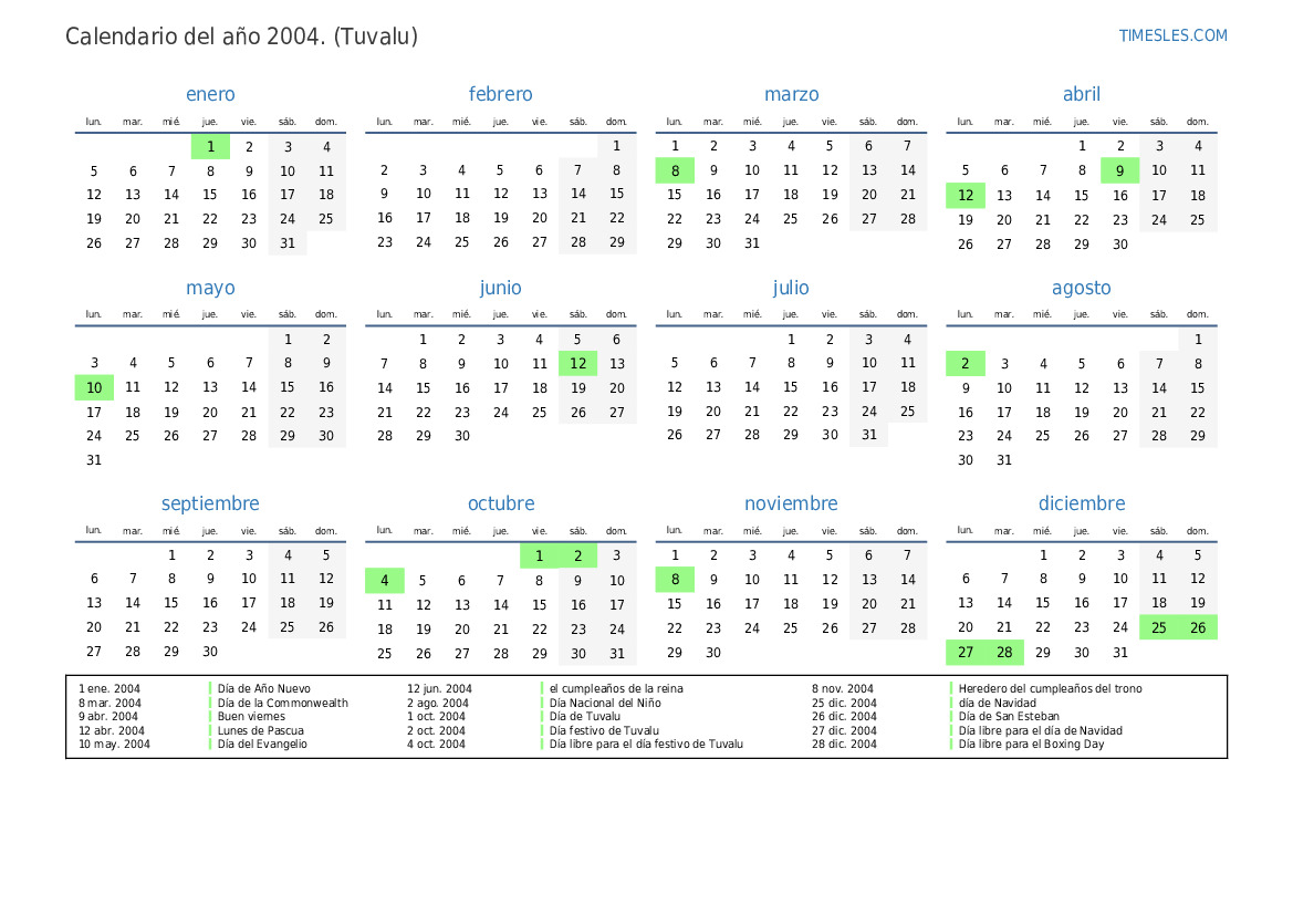4 oct. 2004 Día libre para el día festivo de Tuvalu