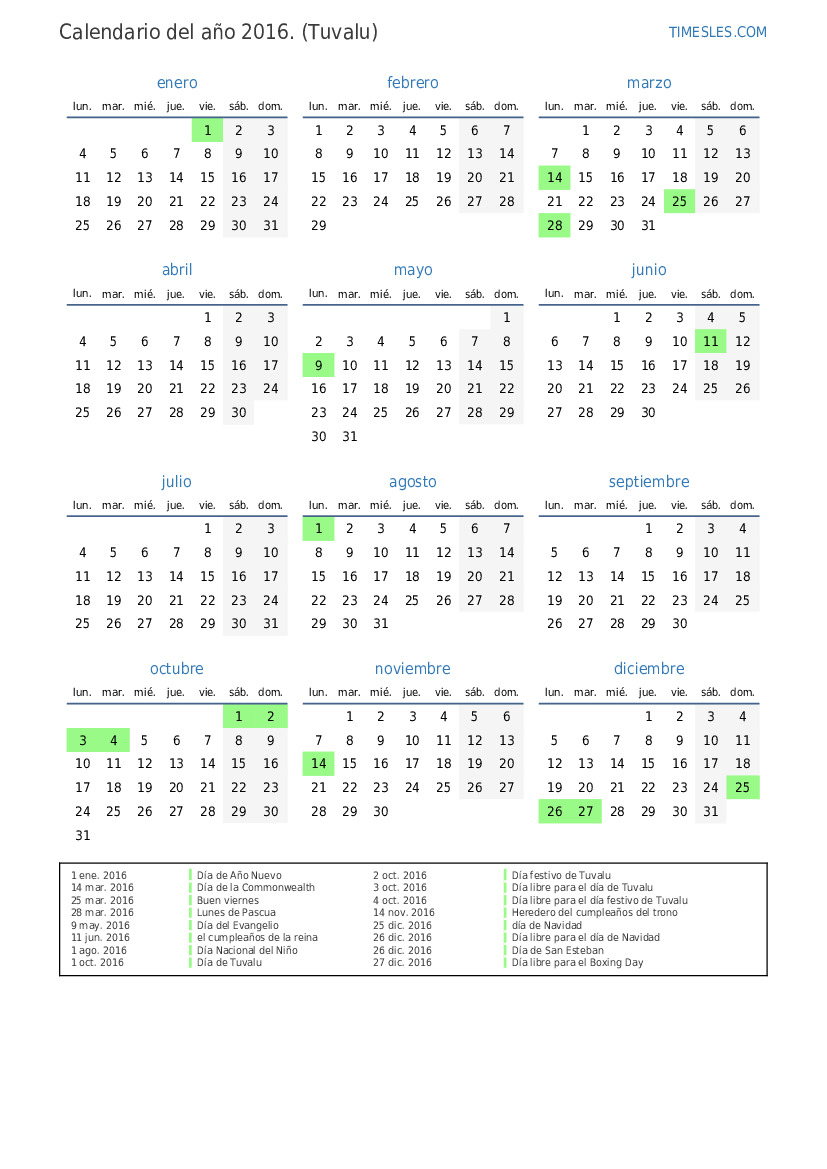 4 oct. 2016 Día libre para el día festivo de Tuvalu