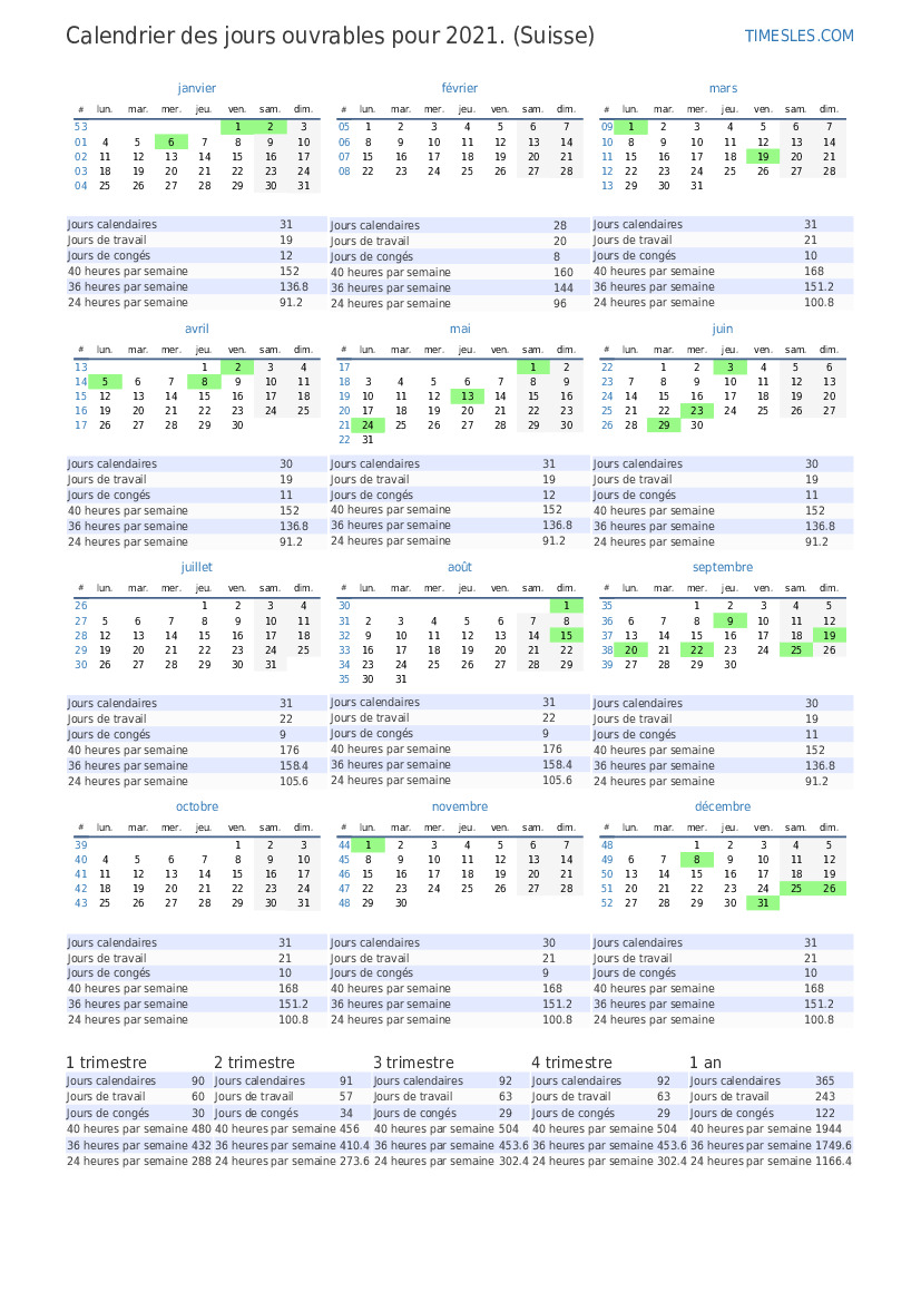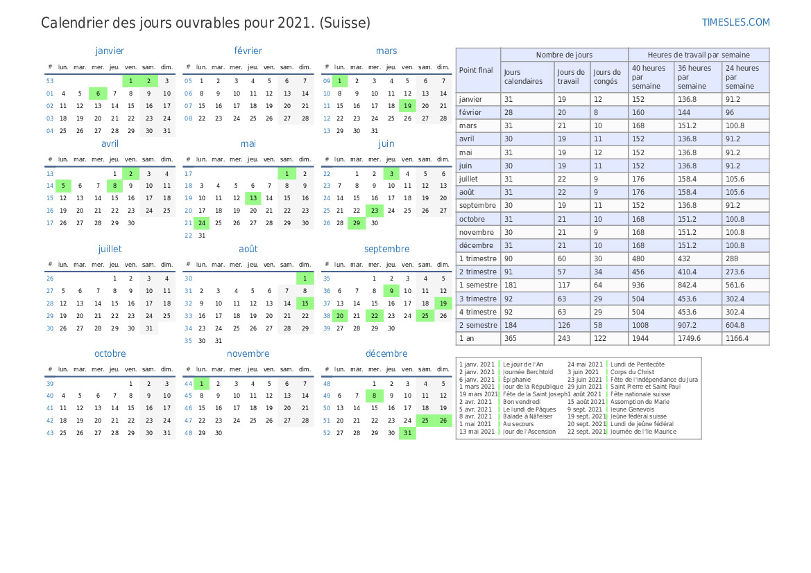Calendrier de février 2021 jours ouvrés pour la Suisse