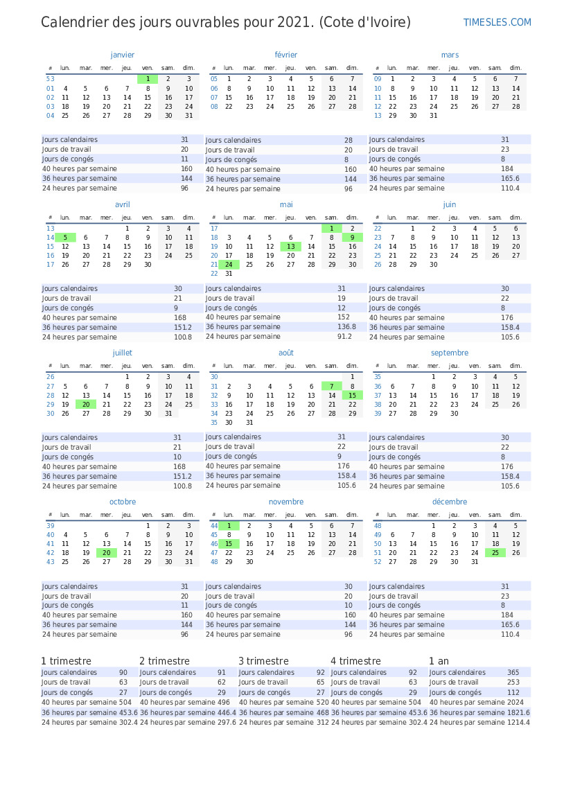 Calendrier de mars 2021 jours ouvrés pour la Côte d'Ivoire