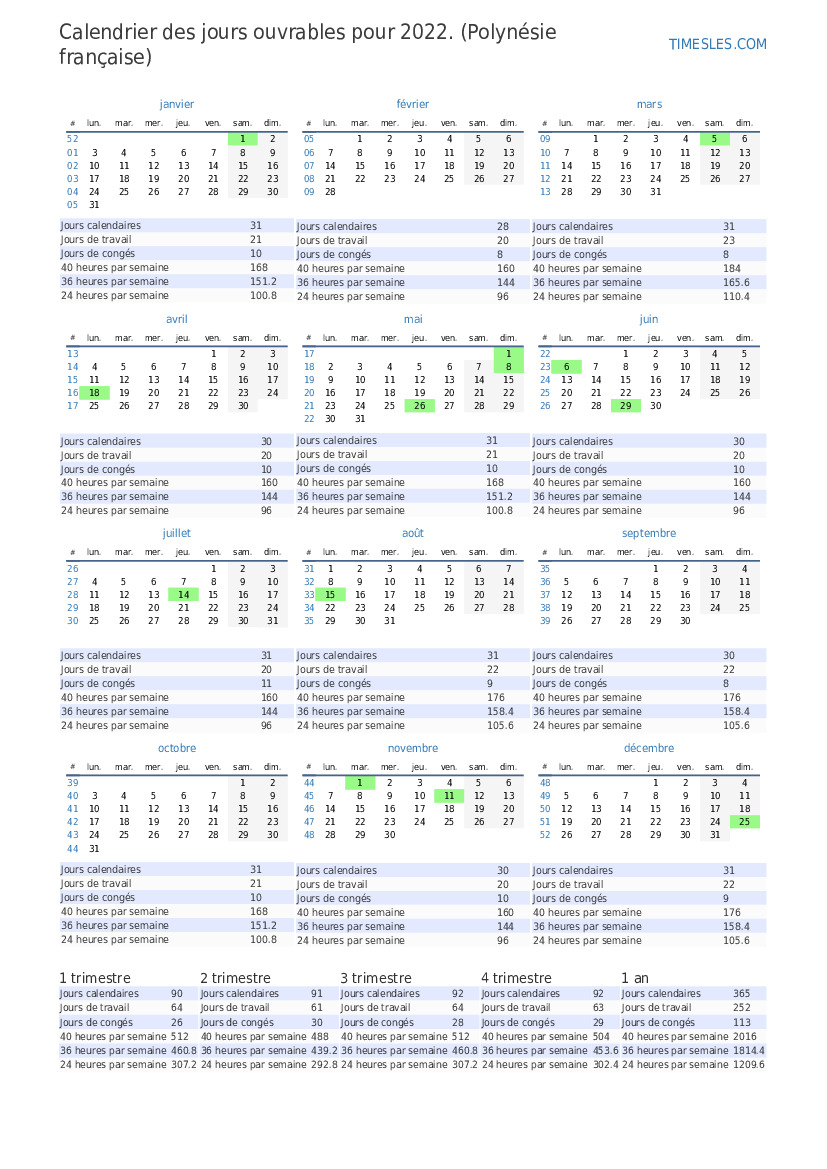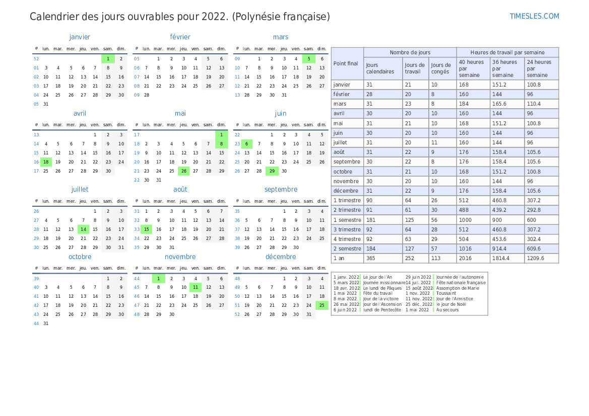 Calendrier de juin 2022 jours ouvrés pour la Polynésie française
