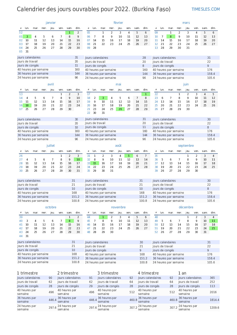 Calendrier de septembre 2022 jours ouvrés pour le Burkina Faso