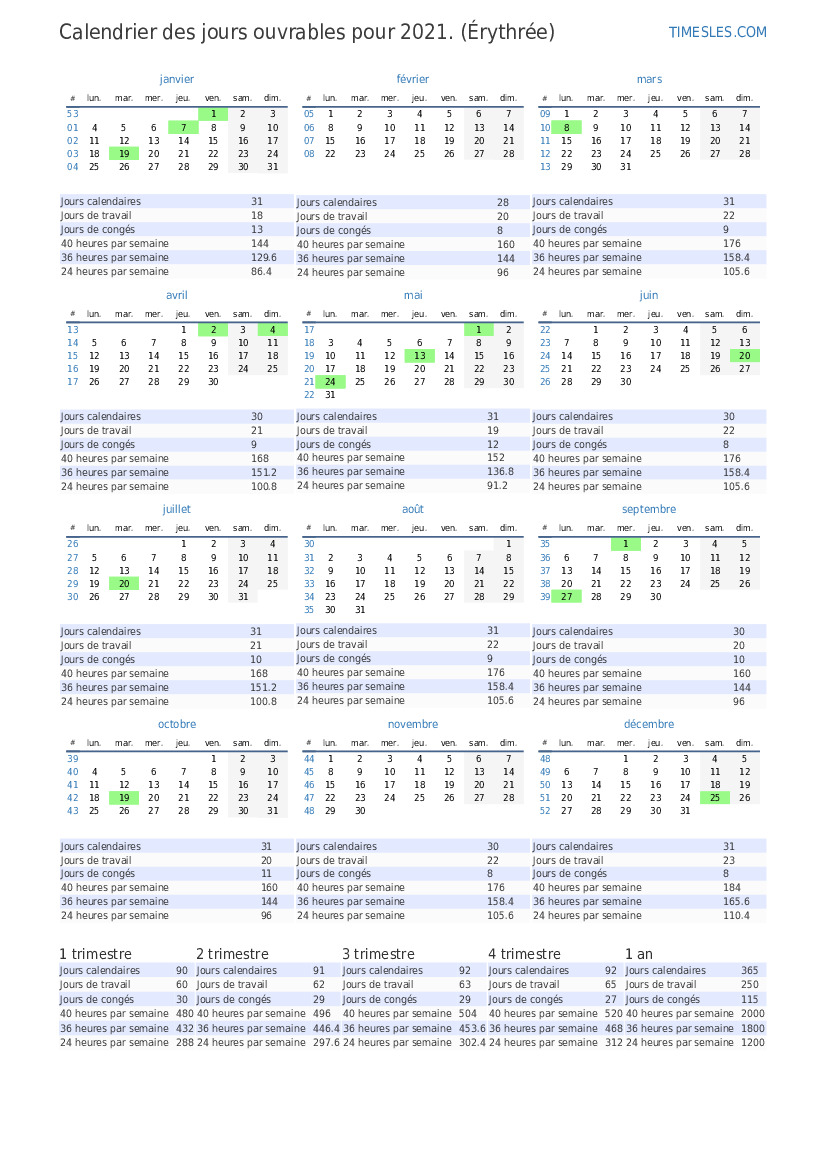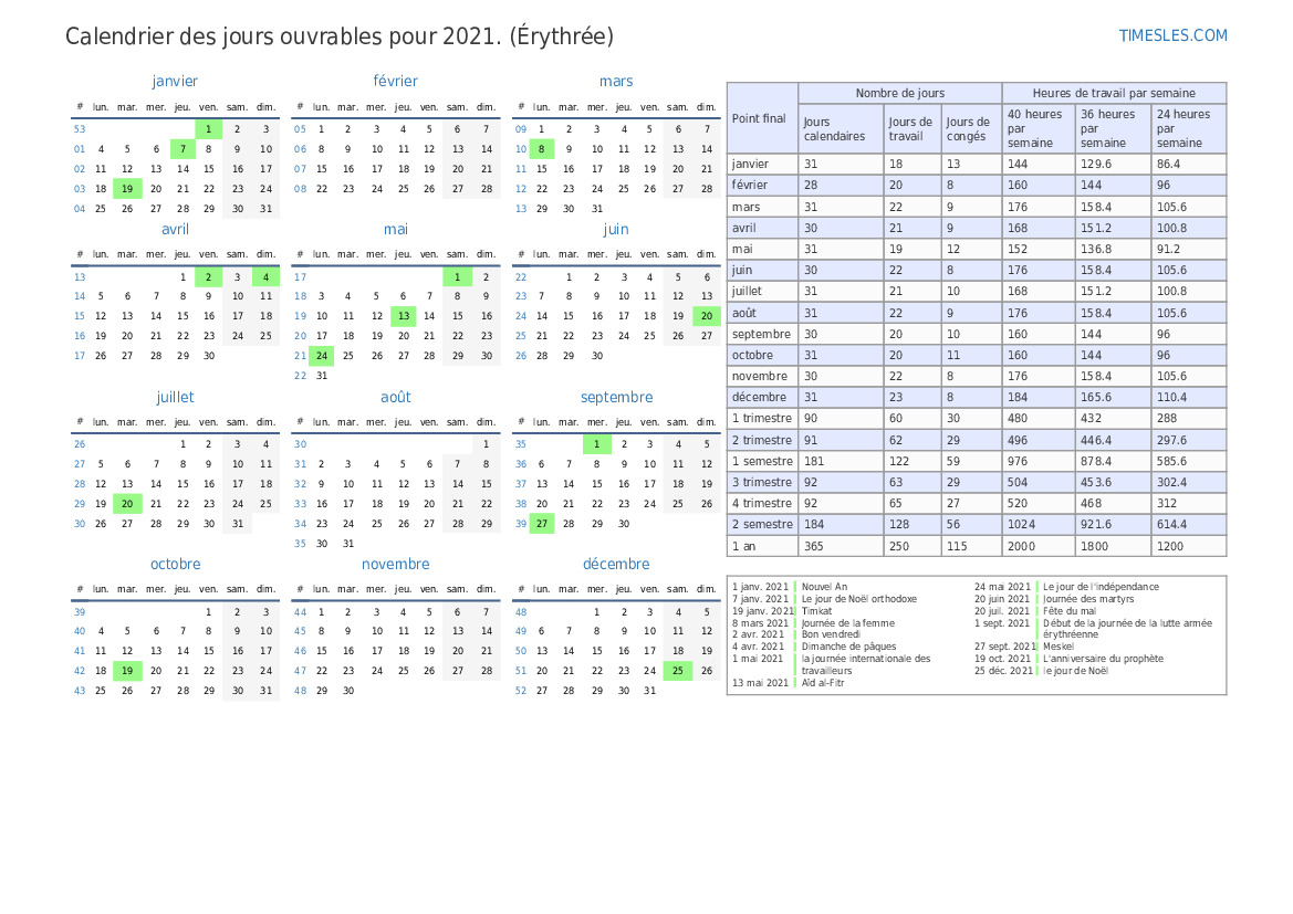 Téléchargez et imprimez le calendrier des jours ouvrables PDF avec jours fériés et week-ends pour le 4 trimestre 2021 pour l'Érythrée