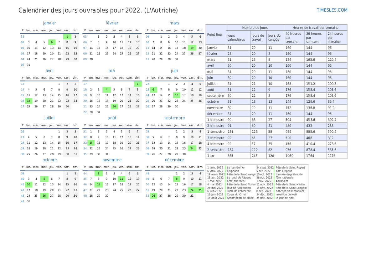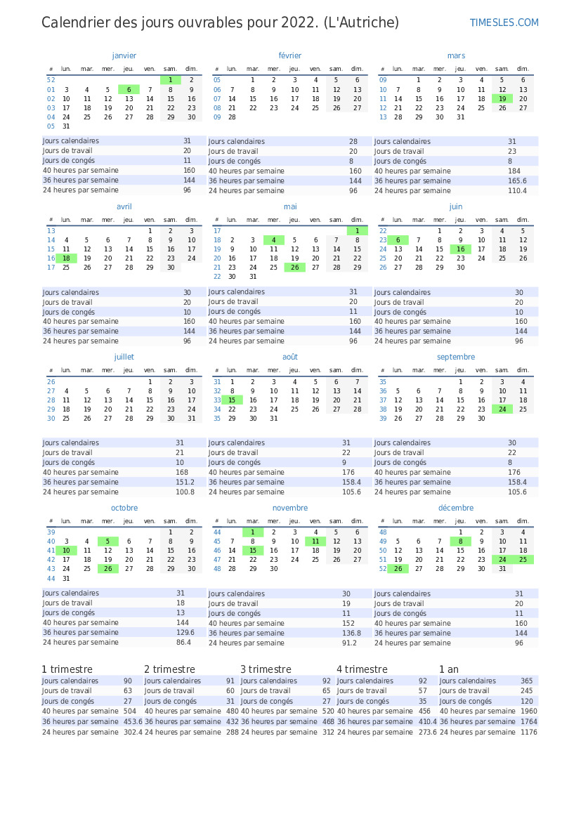 Calendrier du 1 trimestre 2022 pour l'Autriche