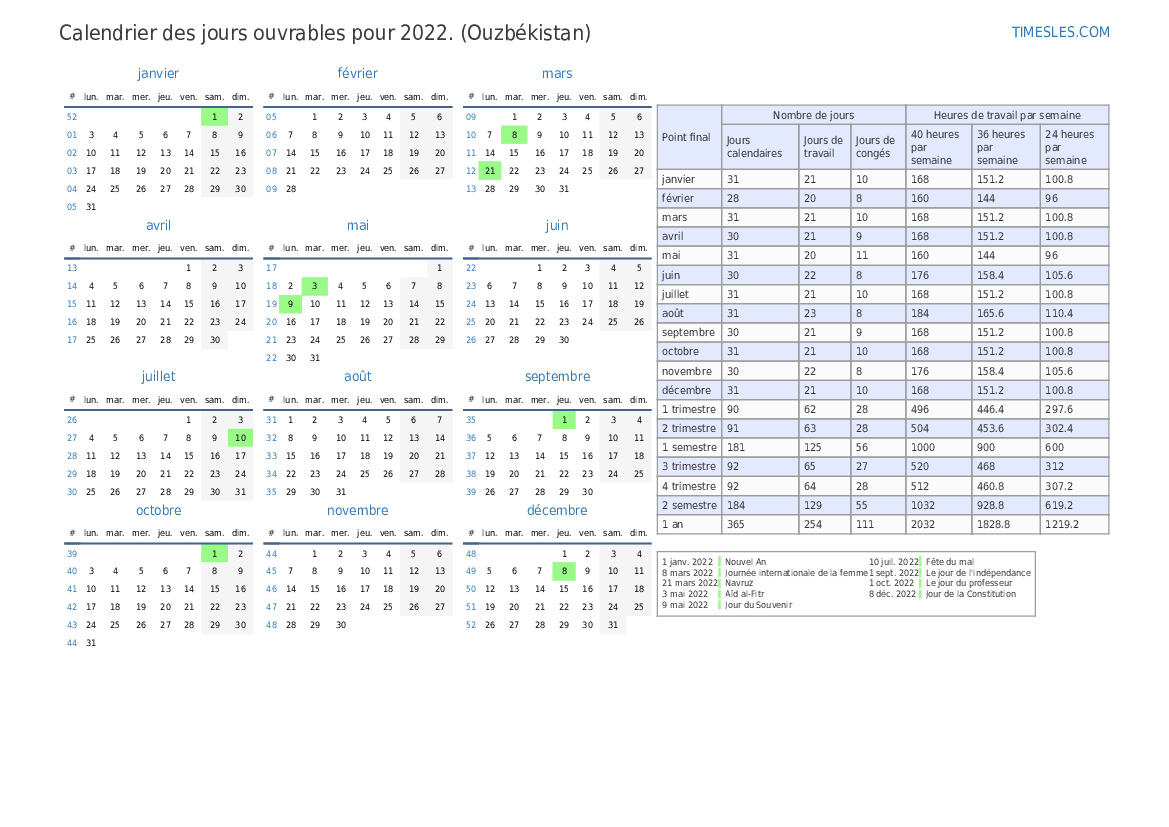 Calendrier des jours ouvrables avec jours fériés et week-ends du 1 trimestre 2022 pour l'Ouzbékistan