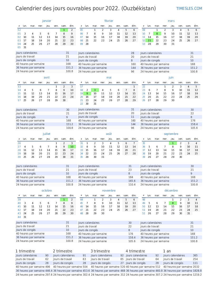 Calendrier du 1 trimestre 2022 pour l'Ouzbékistan