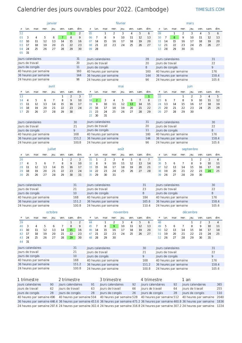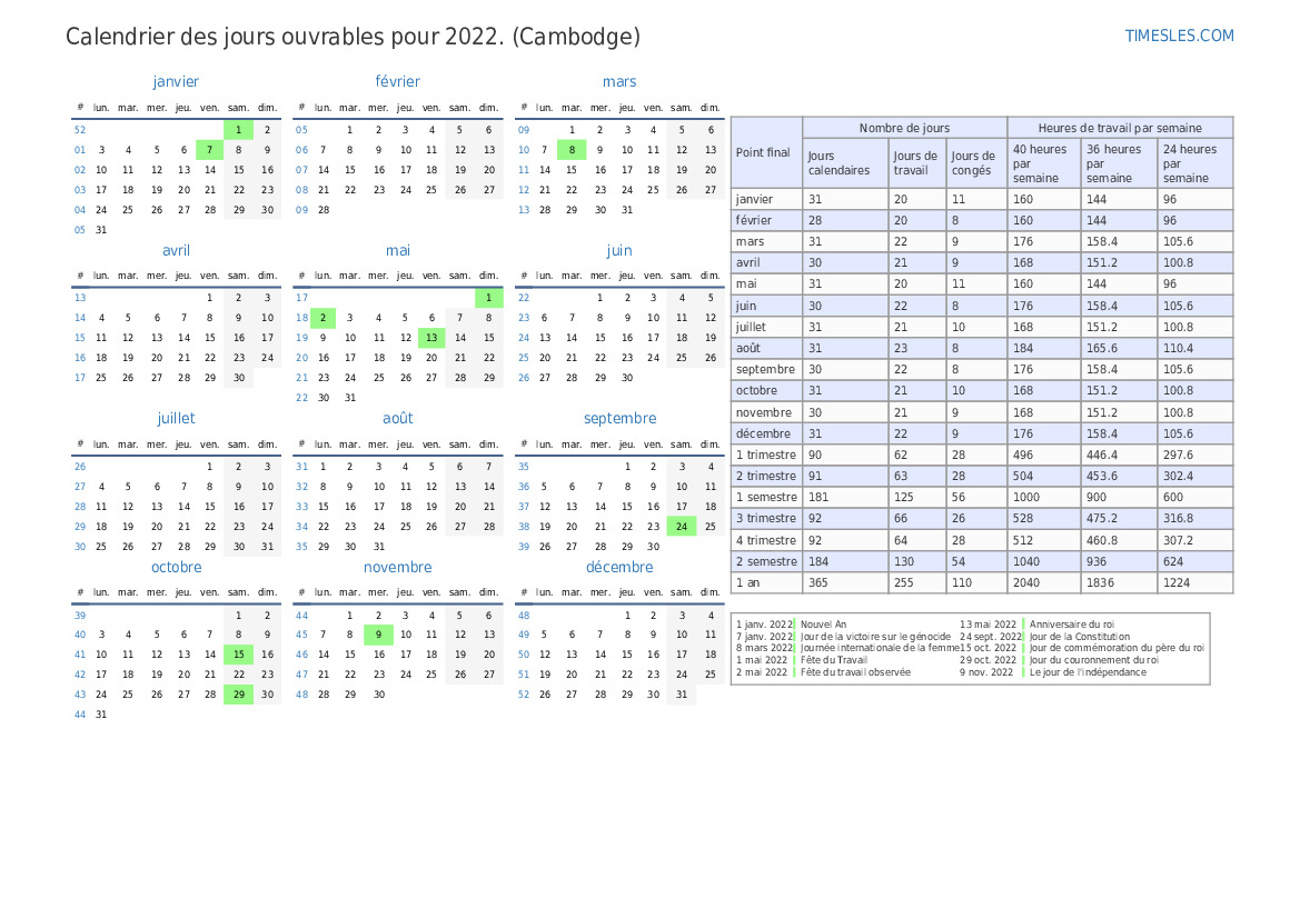 Pour le 3 trimestre 2022, il y a 2 vacances et jours de congé au Cambodge. Le 3 trimestre 2022 commence le le vendredi et se termine le le vendredi.