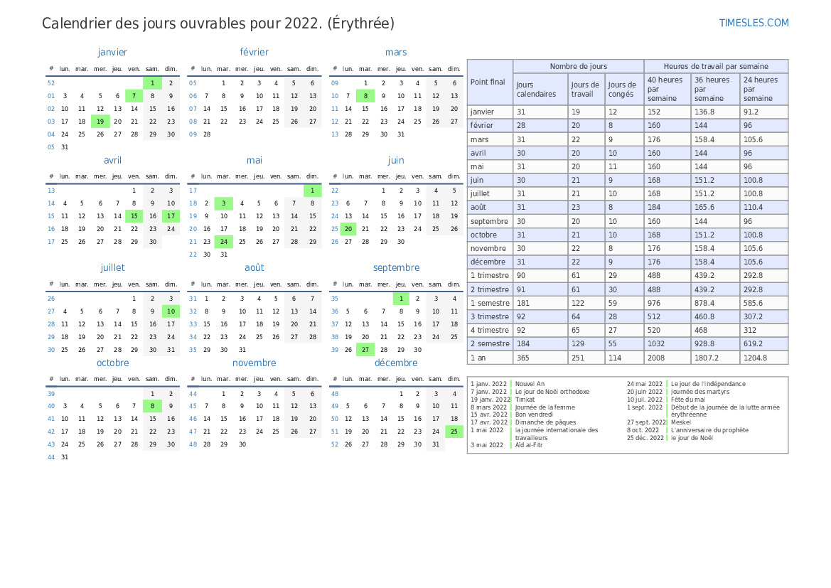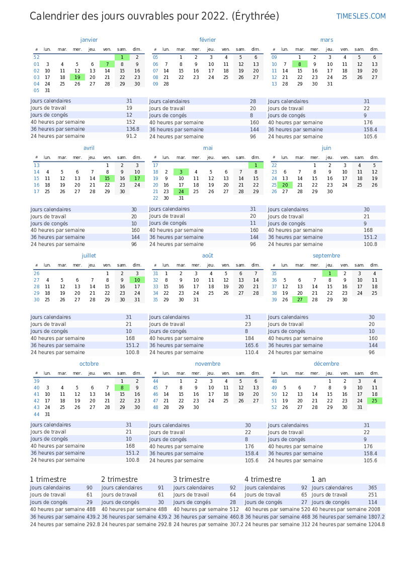 Téléchargez et imprimez le calendrier des jours ouvrables PDF avec jours fériés et week-ends pour le 4 trimestre 2022 pour l'Érythrée