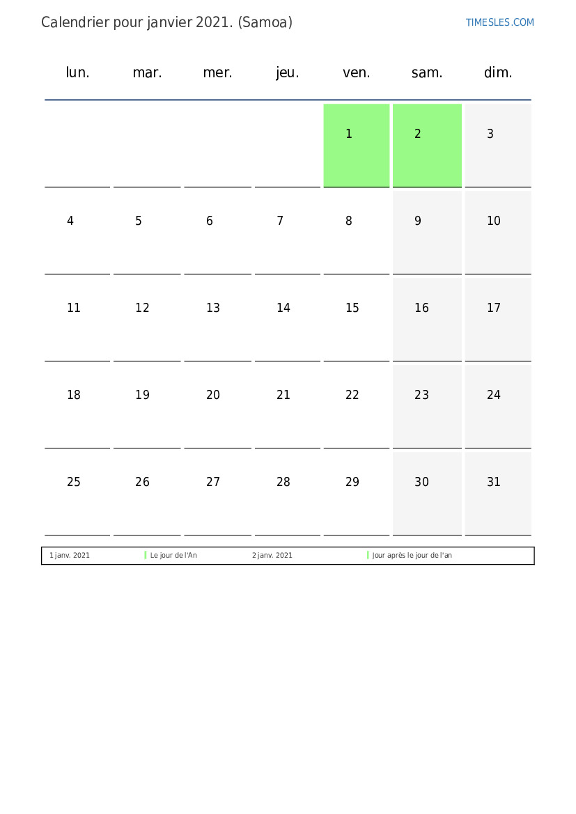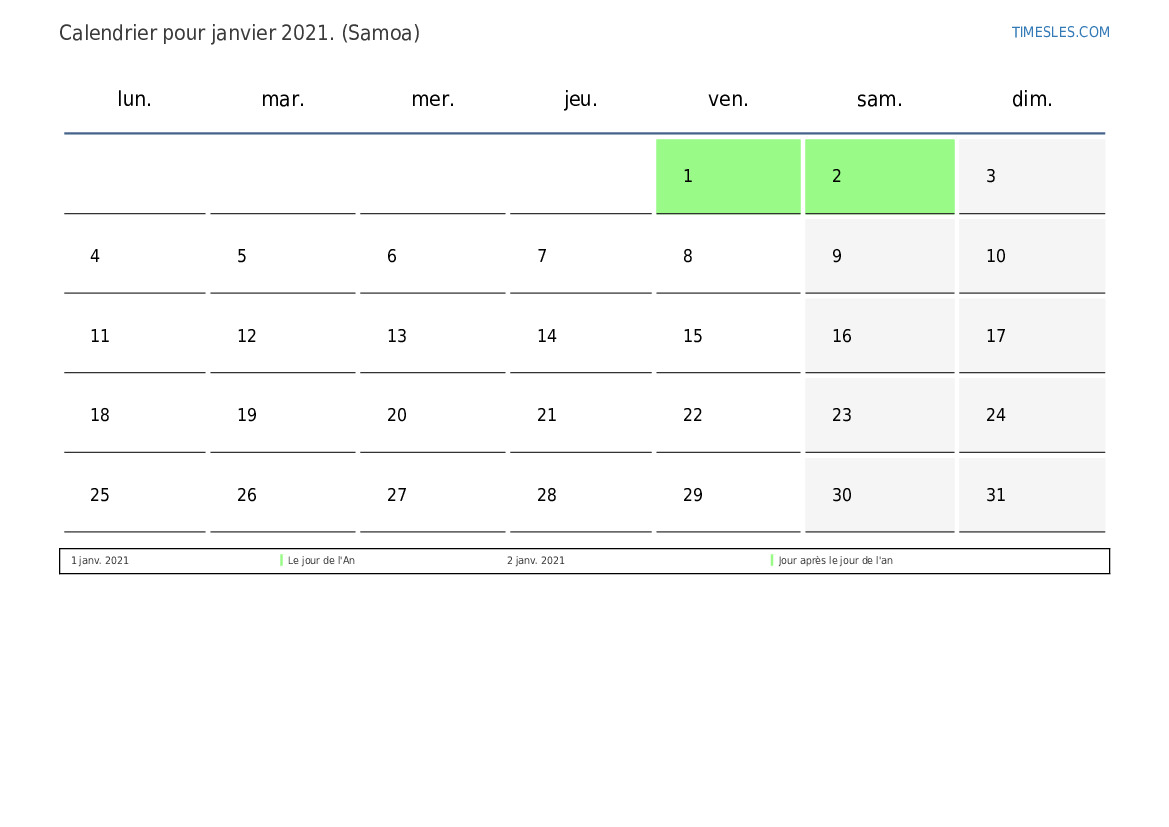 Calendrier des jours fériés et week-ends de janvier 2021 pour Samoa