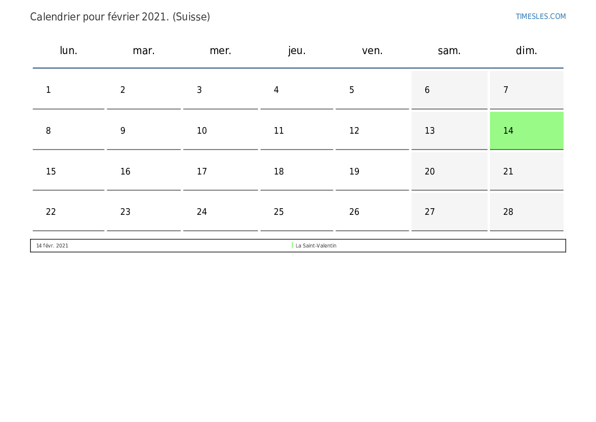 Calendrier des jours fériés et week-ends de février 2021 pour la Suisse