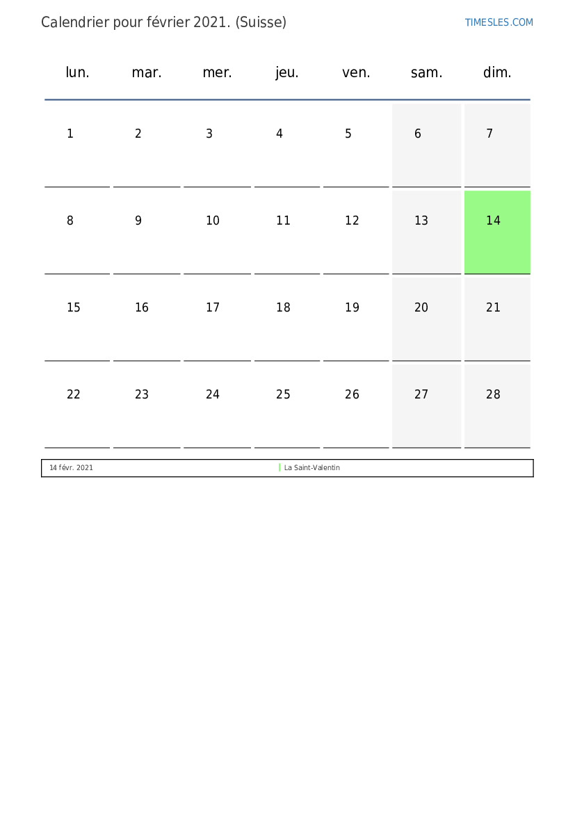Téléchargez et imprimez le calendrier PDF avec jours fériés et week-ends de février 2021 pour la Suisse