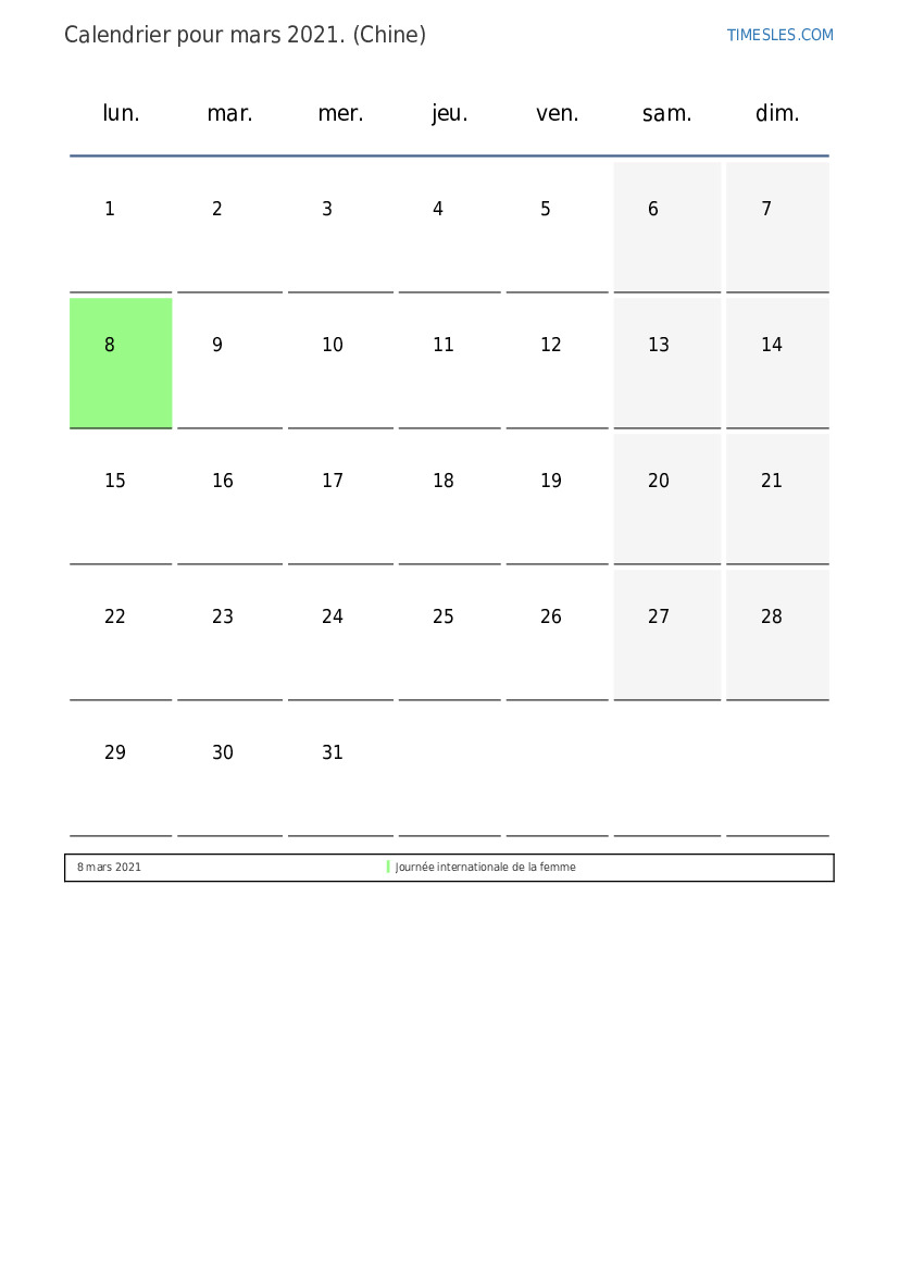 Calendrier des jours fériés et week-ends de mars 2021 pour la Chine
