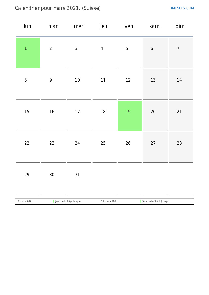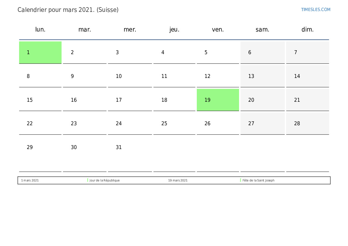 Calendrier des jours fériés et week-ends de mars 2021 pour la Suisse