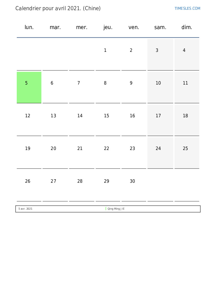 Calendrier des jours fériés et week-ends de avril 2021 pour la Chine