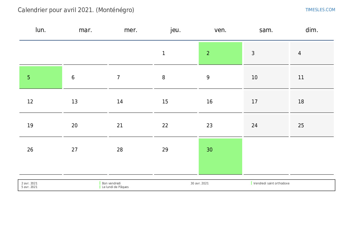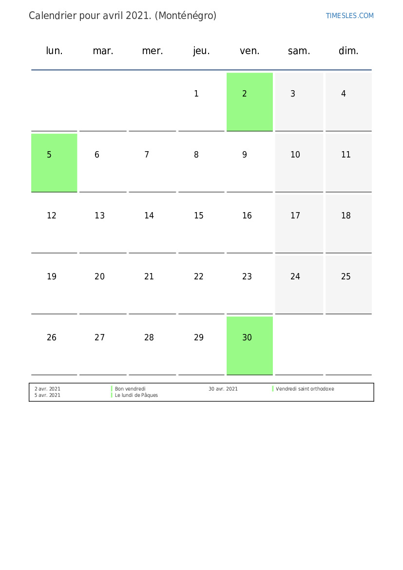 Calendrier des jours fériés et week-ends de avril 2021 pour le Monténégro