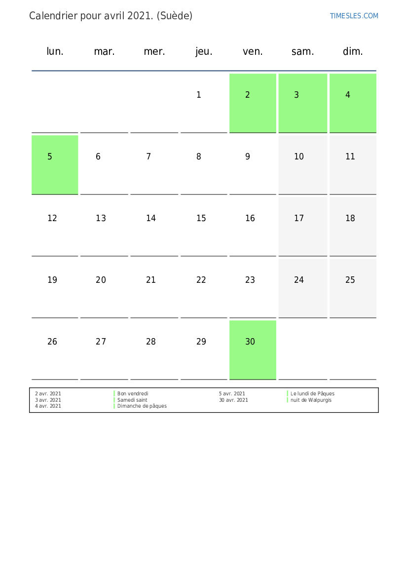 Le mois de avril comprend 30 jours. Nous sommes au 4 mois de 2021. Saison de l'année: printemps. Le mois de janvier commence le jeudi et se termine le vendredi. Au mois de avril 2021, il y a 5 vacances et jours de congé en Suède.
