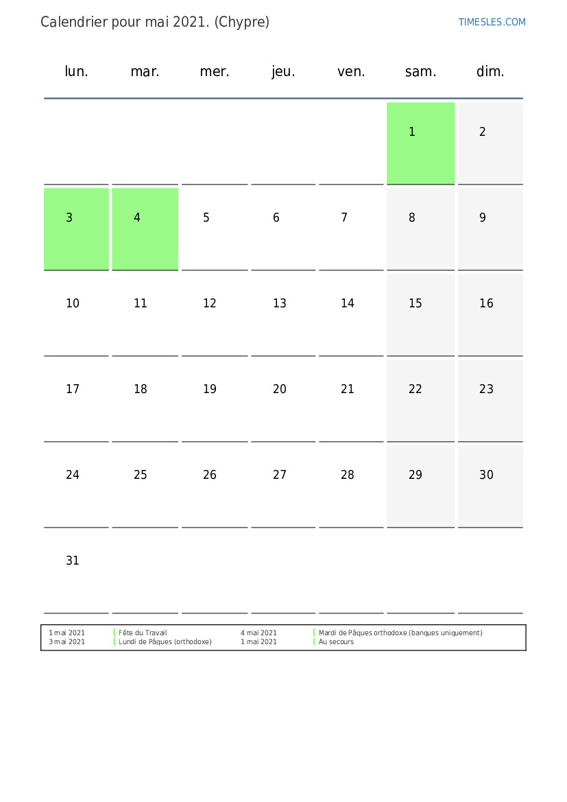 Calendrier des jours fériés et week-ends de mai 2021 pour Chypre