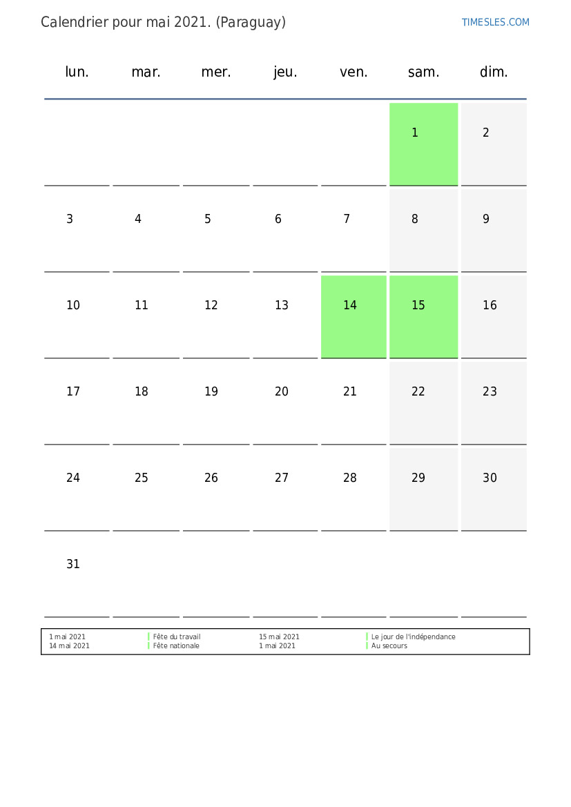 Le mois de mai comprend 31 jours. Nous sommes au 5 mois de 2021. Saison de l'année: printemps. Le mois de janvier commence le samedi et se termine le lundi. Au mois de mai 2021, il y a 4 vacances et jours de congé au Paraguay.