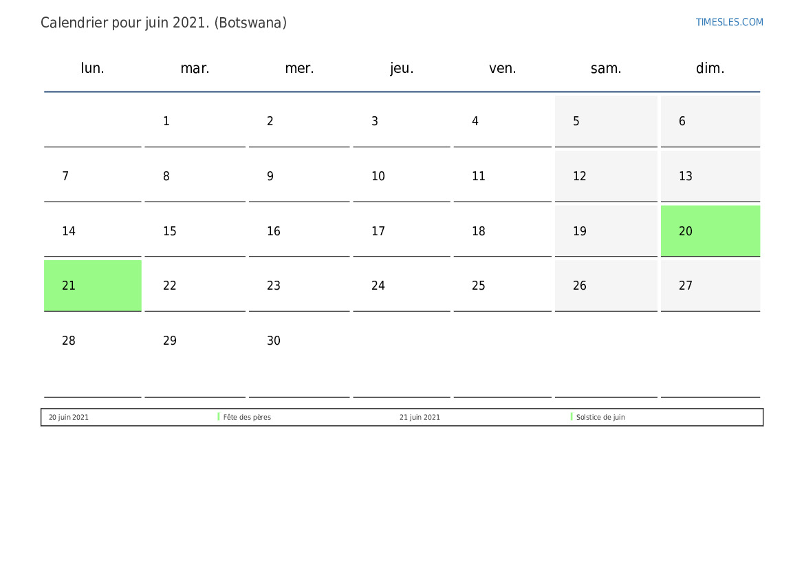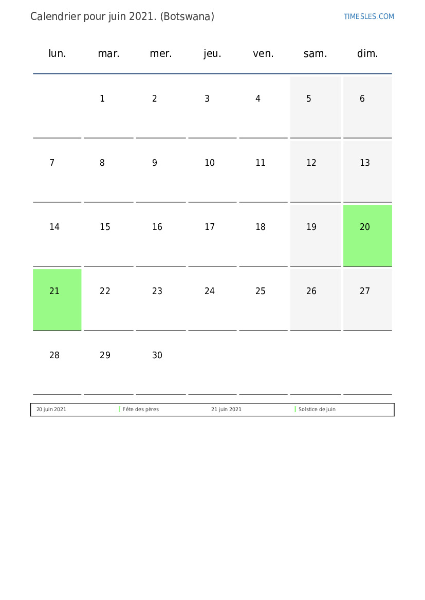 Calendrier des jours fériés et week-ends de juin 2021 pour le Botswana