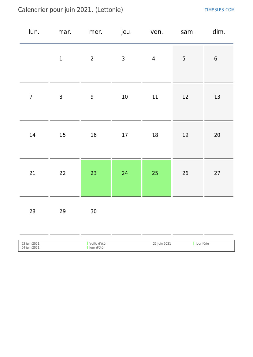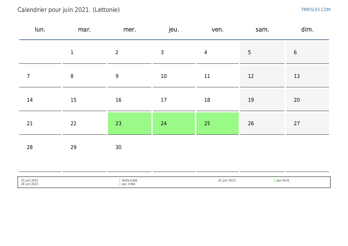 Calendrier des jours fériés et week-ends de juin 2021 pour la Lettonie