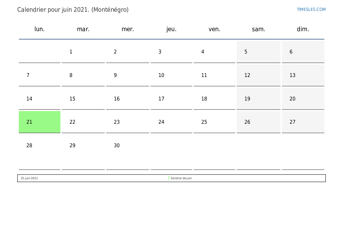 Téléchargez et imprimez le calendrier PDF avec jours fériés et week-ends de juin 2021 pour le Monténégro