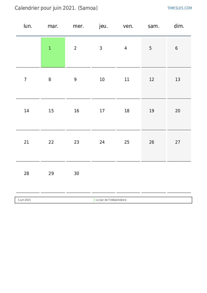 Calendrier des jours fériés et week-ends de juin 2021 pour Samoa