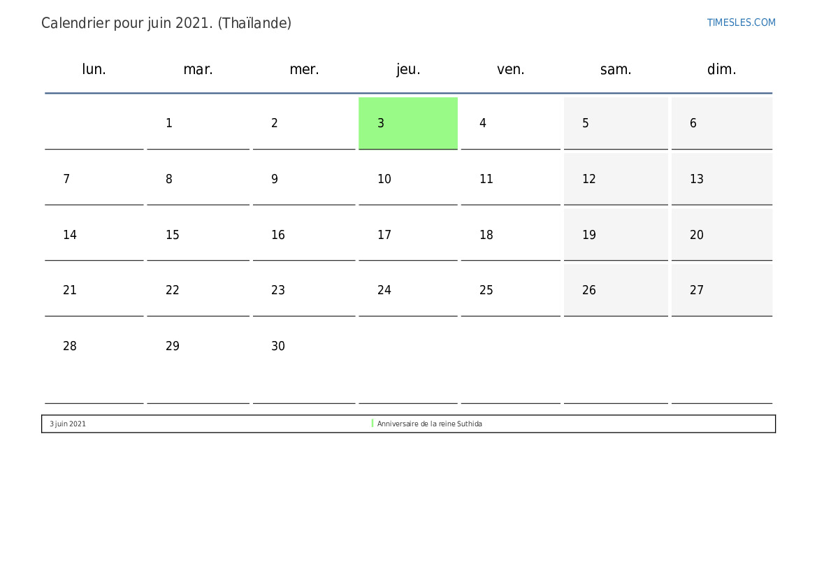Calendrier des jours fériés et week-ends de juin 2021 pour la Thaïlande