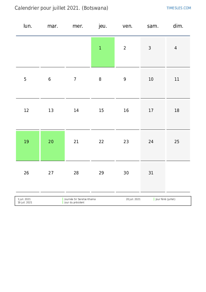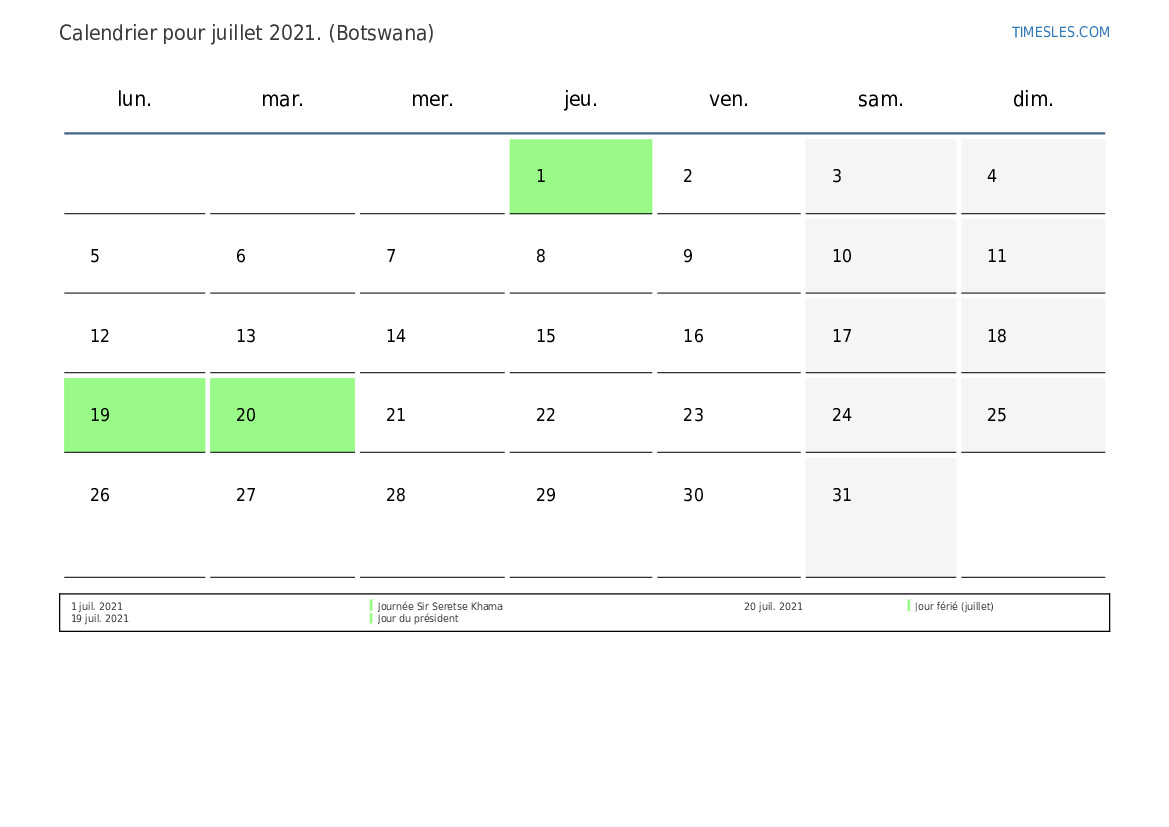Calendrier des jours fériés et week-ends de juillet 2021 pour le Botswana