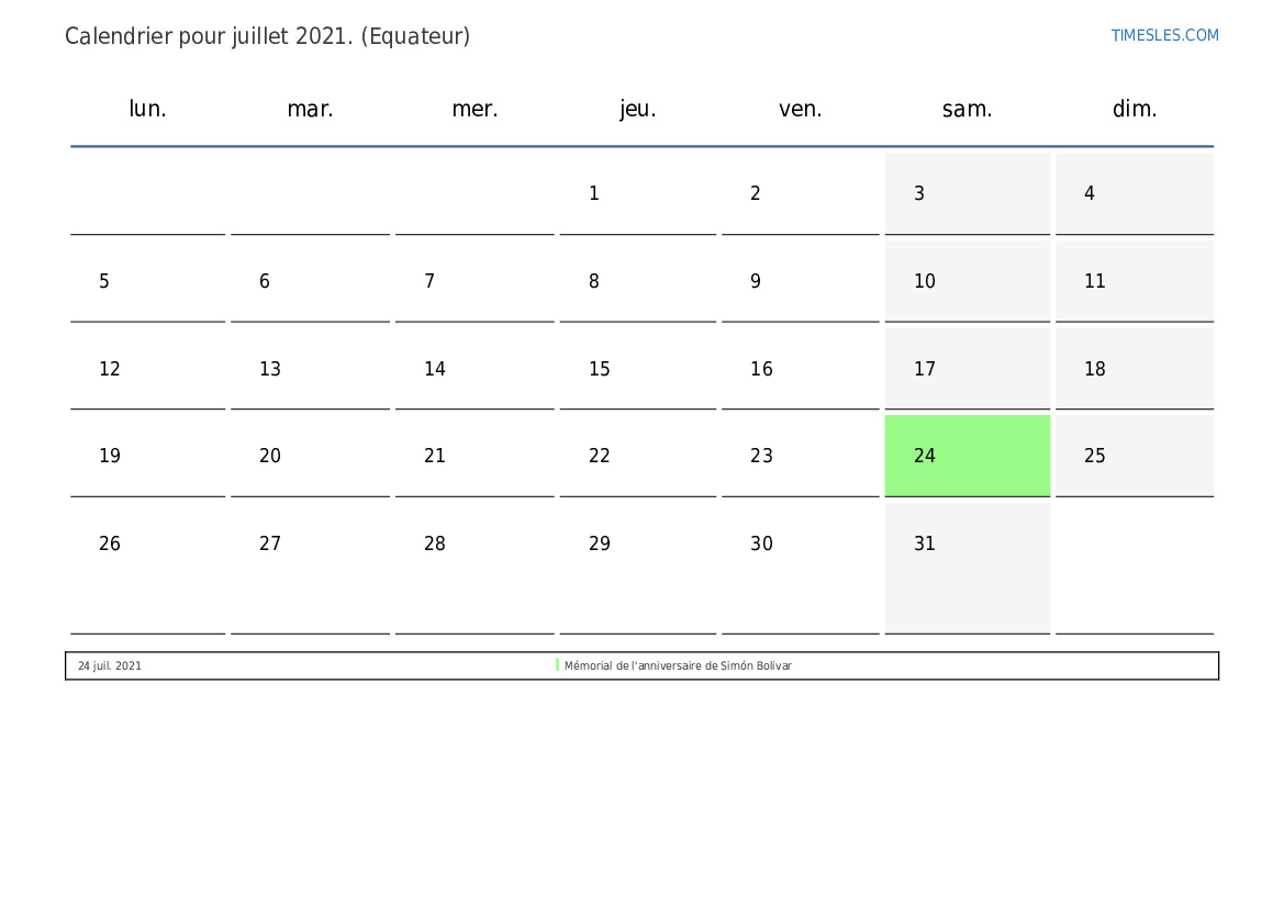 Calendrier des jours fériés et week-ends de juillet 2021 pour l'Équateur