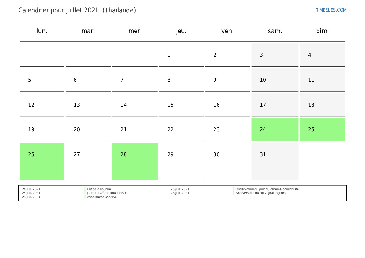 Calendrier des jours fériés et week-ends de juillet 2021 pour la Thaïlande