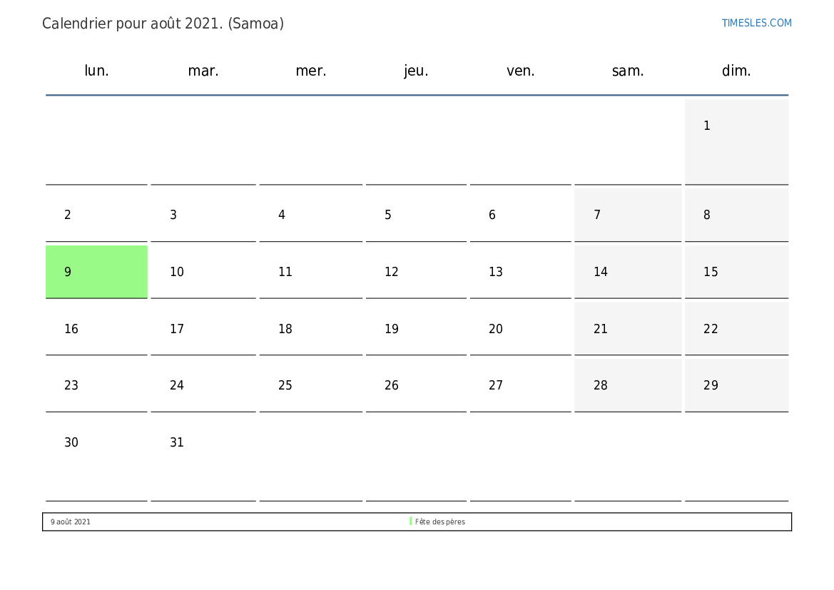 Calendrier des jours fériés et week-ends de août 2021 pour Samoa