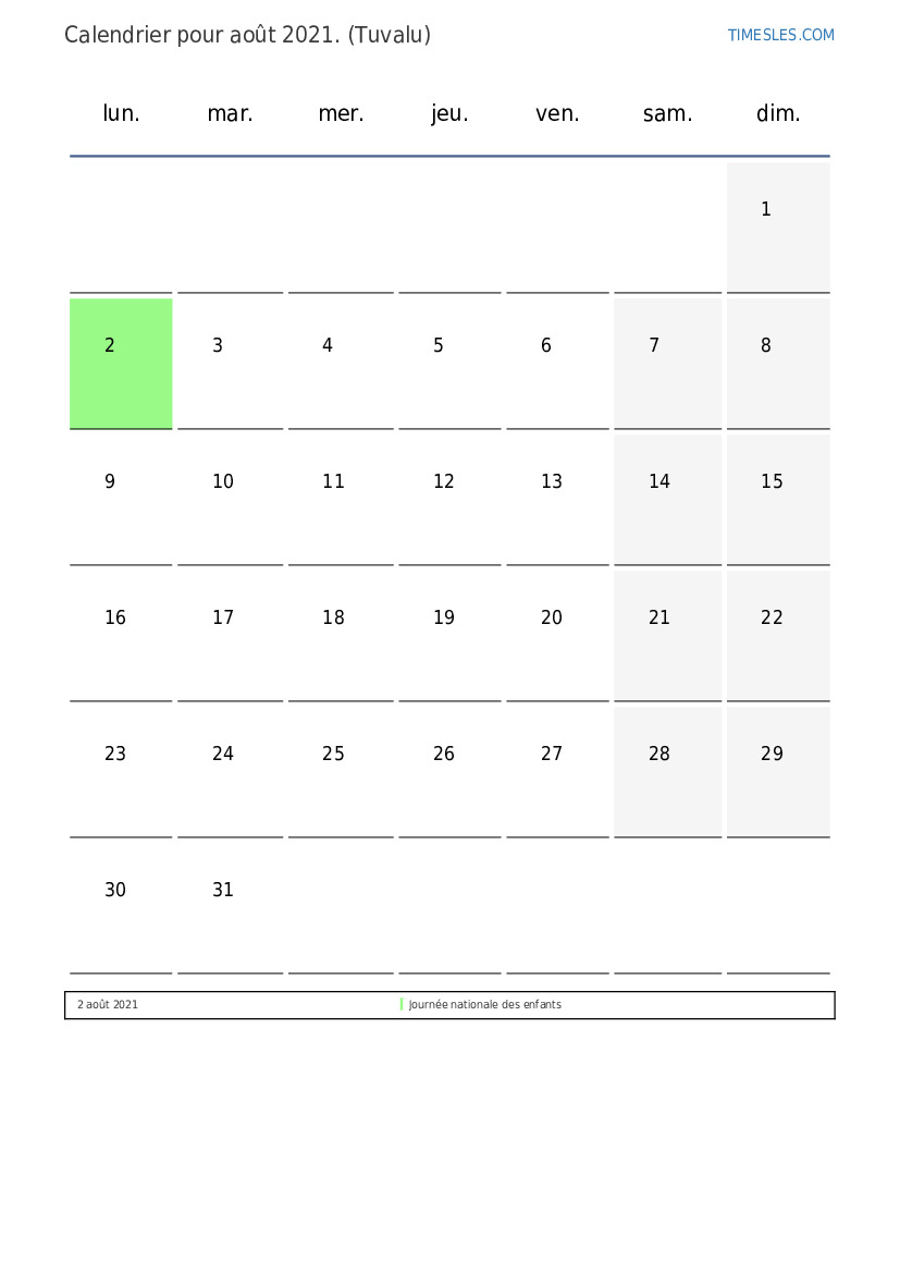 Calendrier des jours fériés et week-ends de août 2021 pour Tuvalu