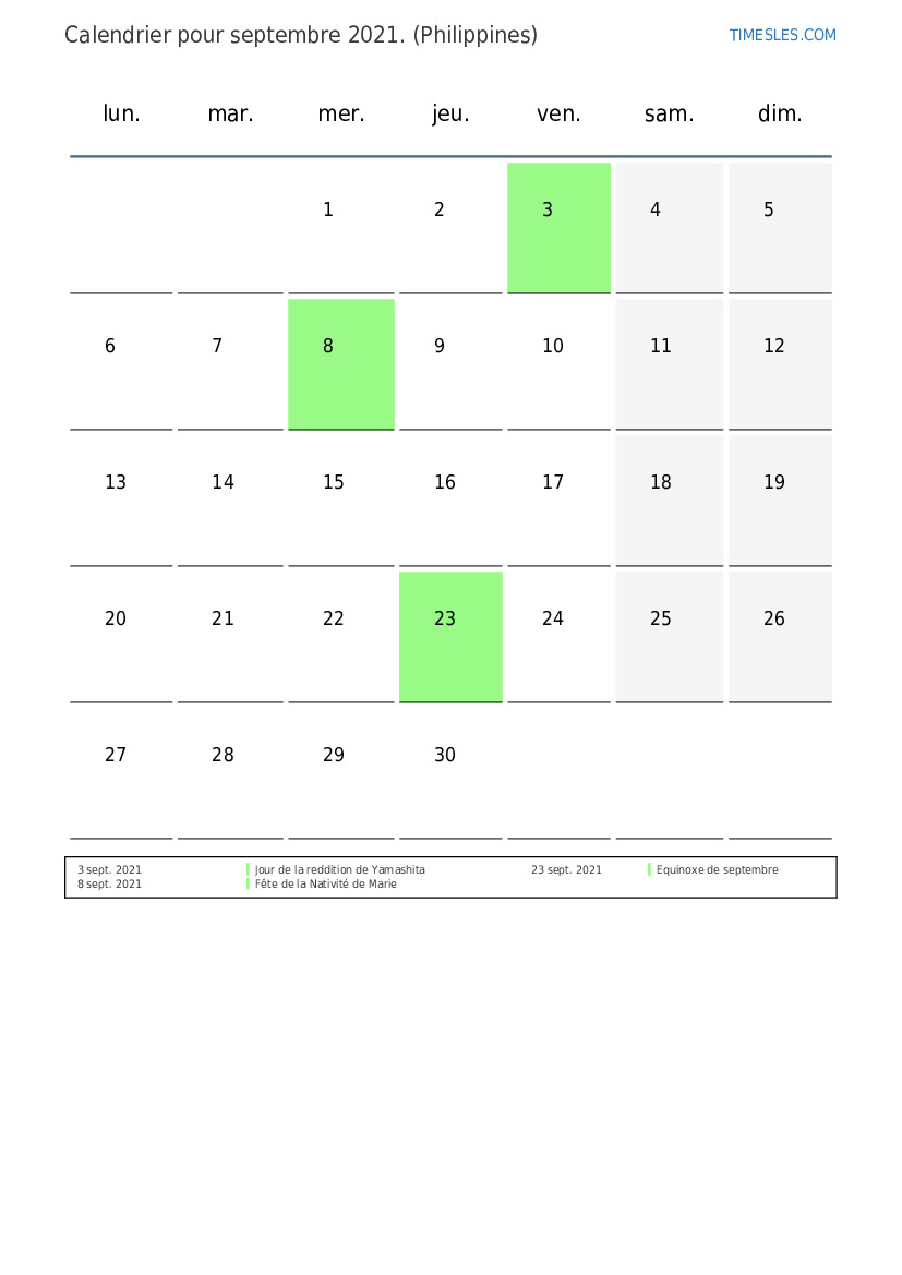 Calendrier des jours fériés et week-ends de septembre 2021 pour les Philippines