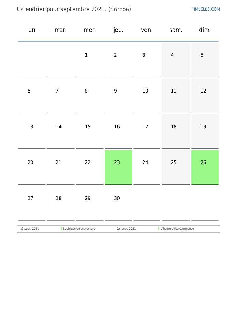 Calendrier des jours fériés et week-ends de septembre 2021 pour Samoa